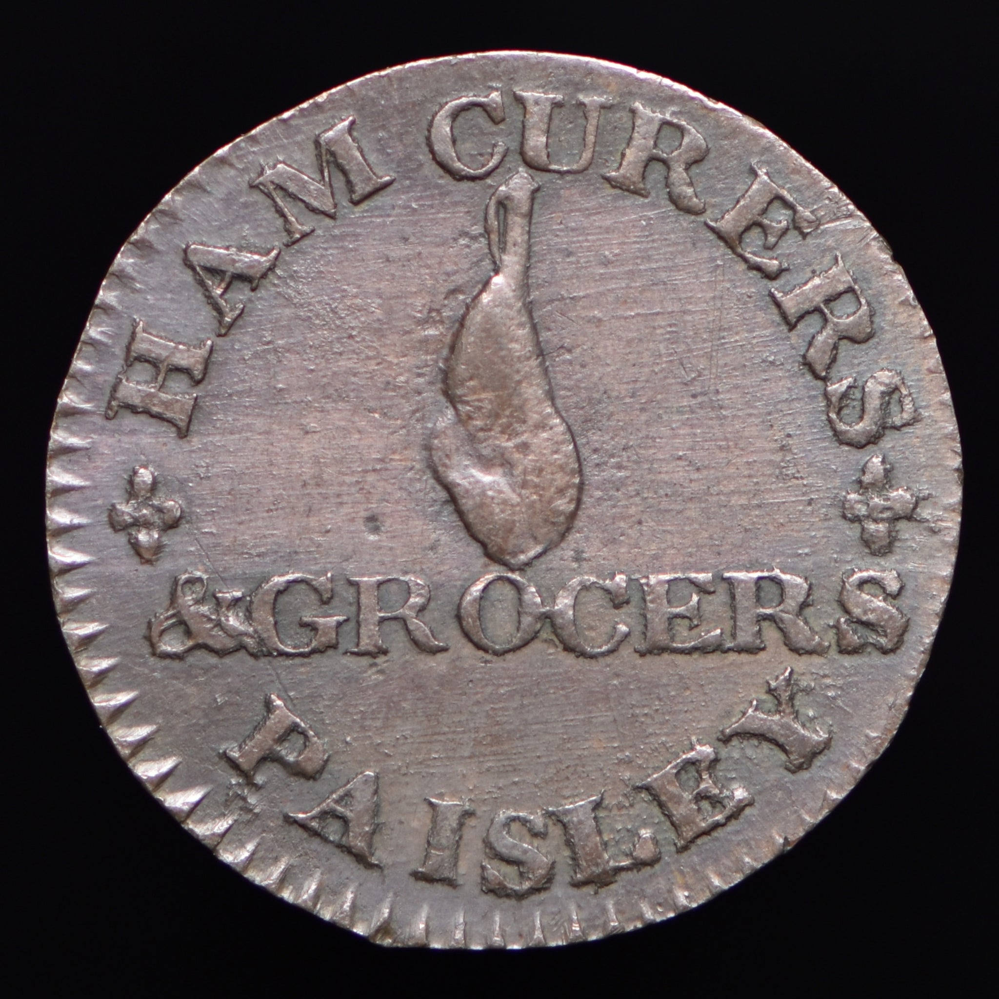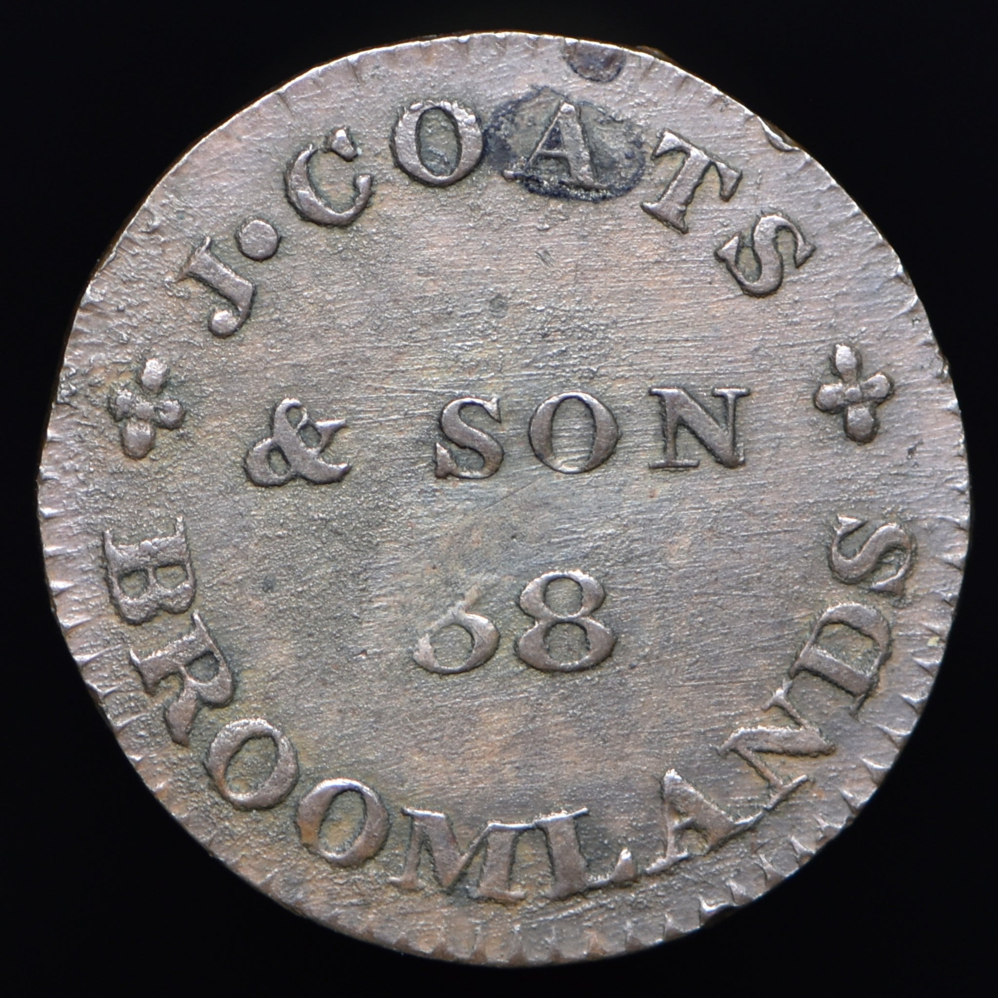 Obv: J. COATS & SON 68 BROOMLANDS in four lines, first and last curved. Rev: A ham suspended, HAM CURERS & GROCERS PAISLEY in three lines, first and last curved. Edge: Plain.