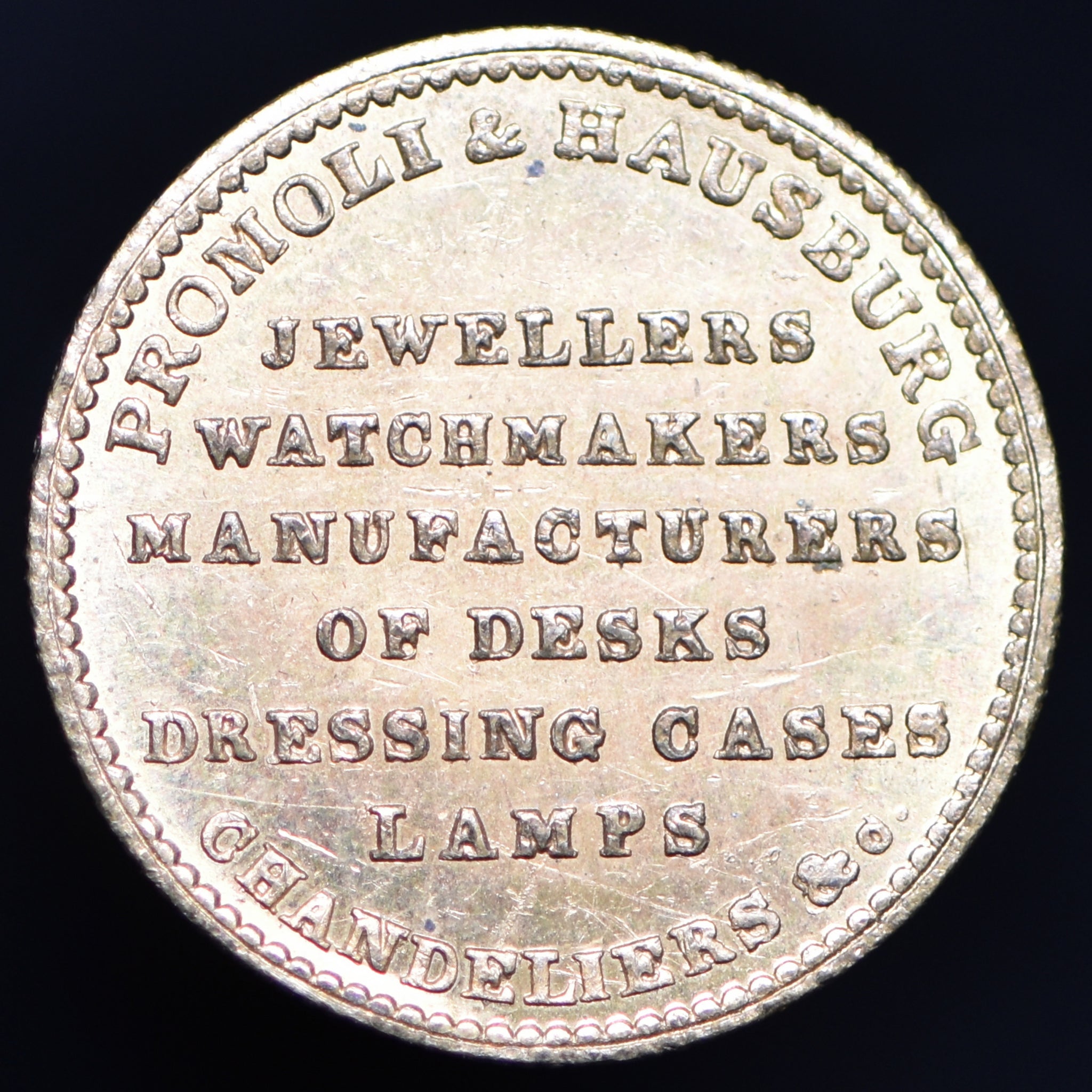 Obv: PROMOLI & HAUSBURG JEWELLERS WATCHMAKERS MANUFACTURERS OF DESKS DRESSING CASES LAMPS CHANDELIERS & C. in eight lines, first and last curved. Rev: 24 in center beaded circle, CHURCH STREET below and curved, OLD POST OFFICE BUILDINGS around, LIVERPOOL below. Edge: Reeded.