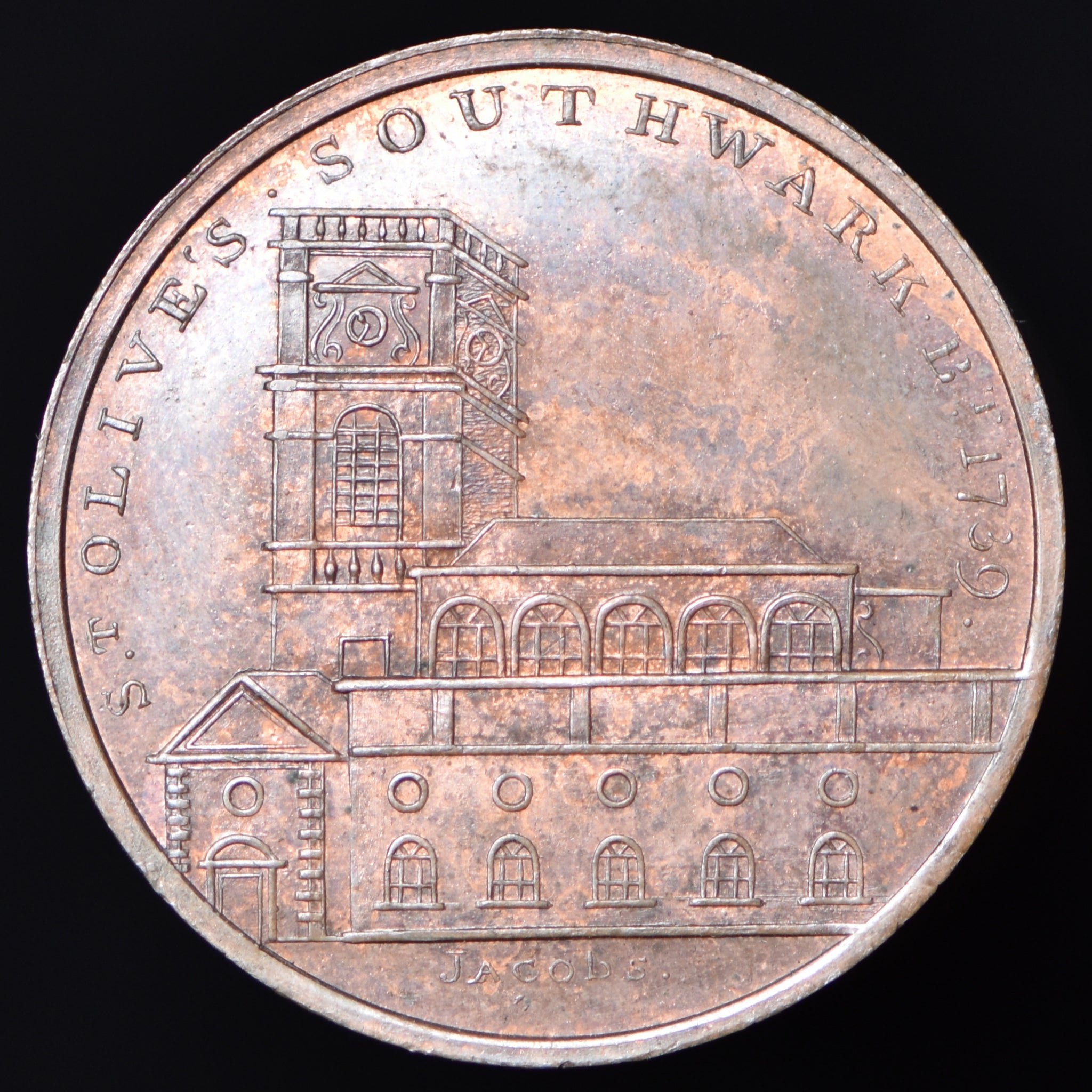Obv: View of church, ST. OLIVE’S SOUTHWARK BT. 1739. (around), JACOBS in exergue. Rev: A cypher P S Co in center beaded circle, DEDICATED TO COLLECTORS OF MEDALS & COINS around. Edge: Plain.