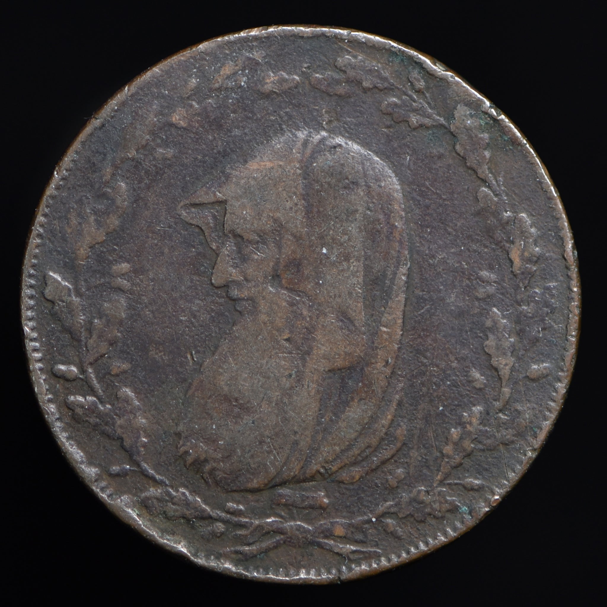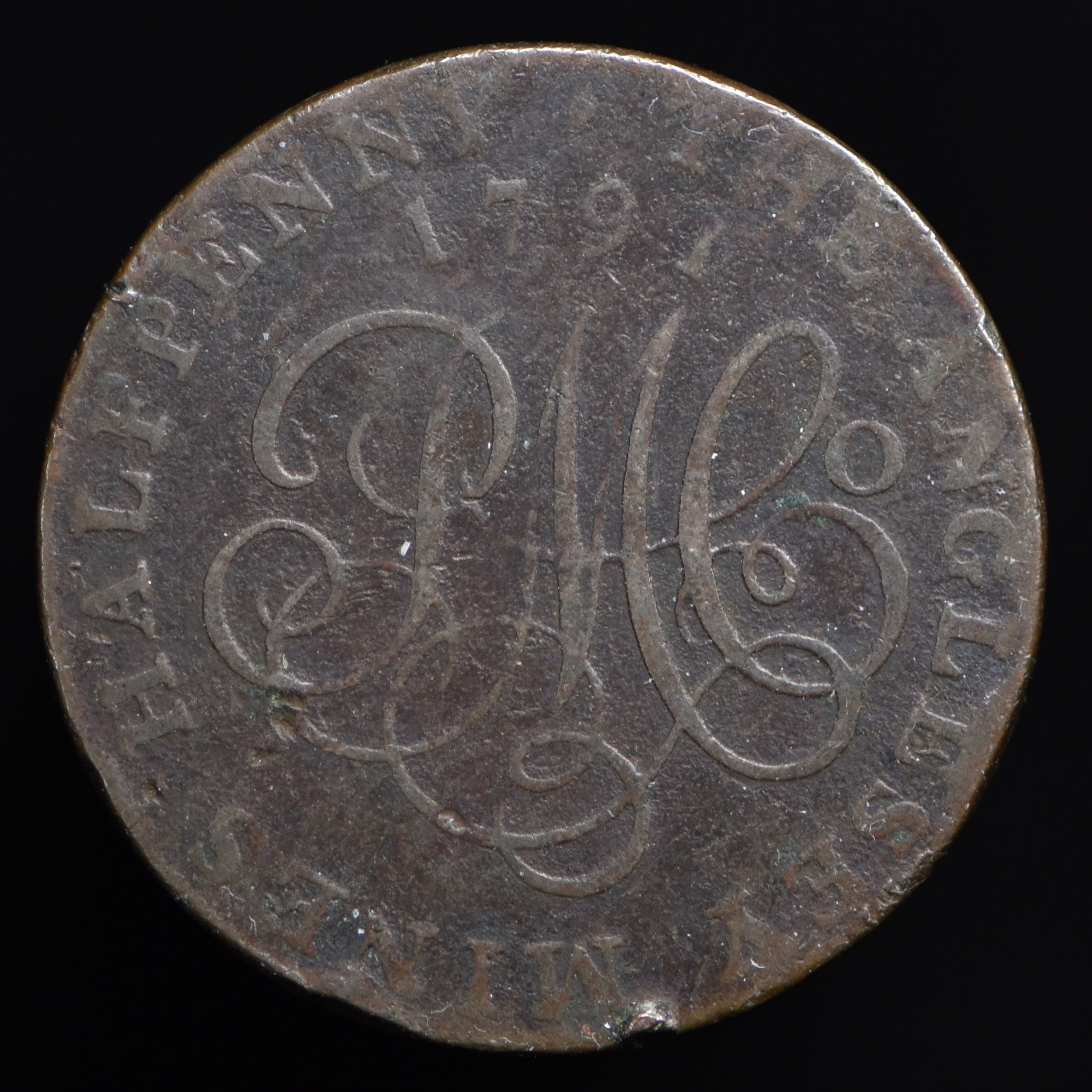 Obv: Druids head bordered by oak wreath. Rev: A cypher P M Co, 1791 above, THE ANGLESEY MINES HALFPENNY around. Edge: PAYABLE IN ANGLESEY OR LONDON.