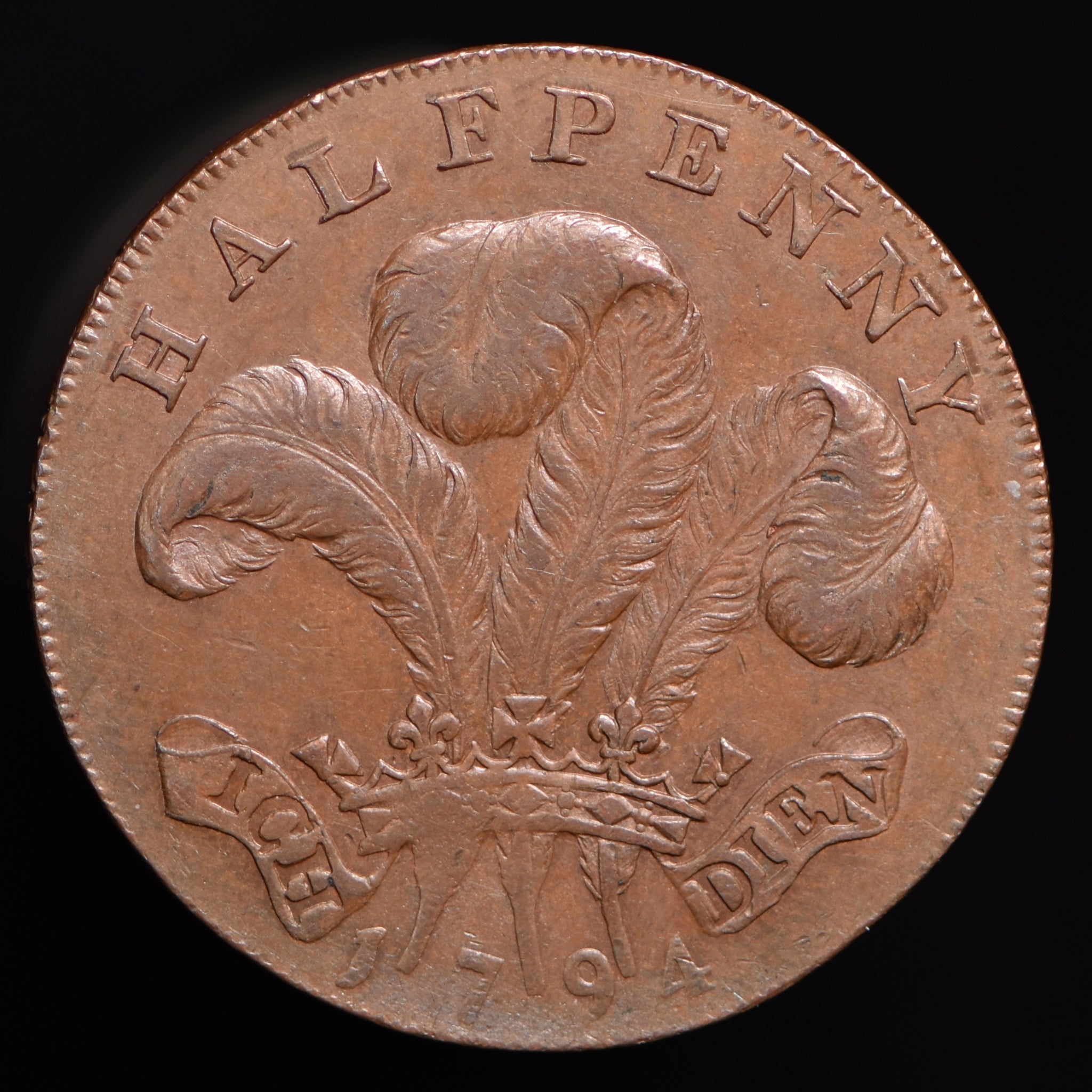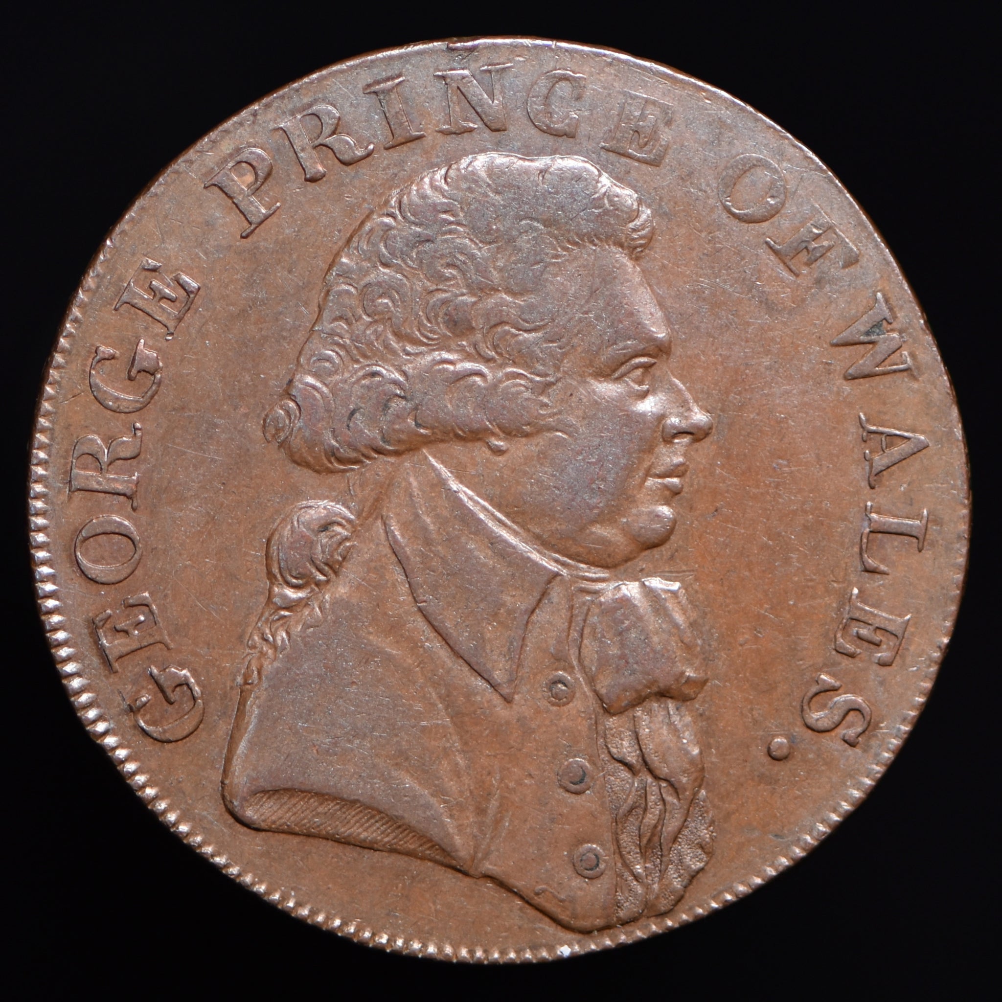 Obv: Bust to right, GEORGE PRINCE OF WALES. (around). Rev: Prince’s crest and motto, HALFPENNY above, 1794 below. Edge: WARLEY CAMP HALFPENNY . X . X . X .