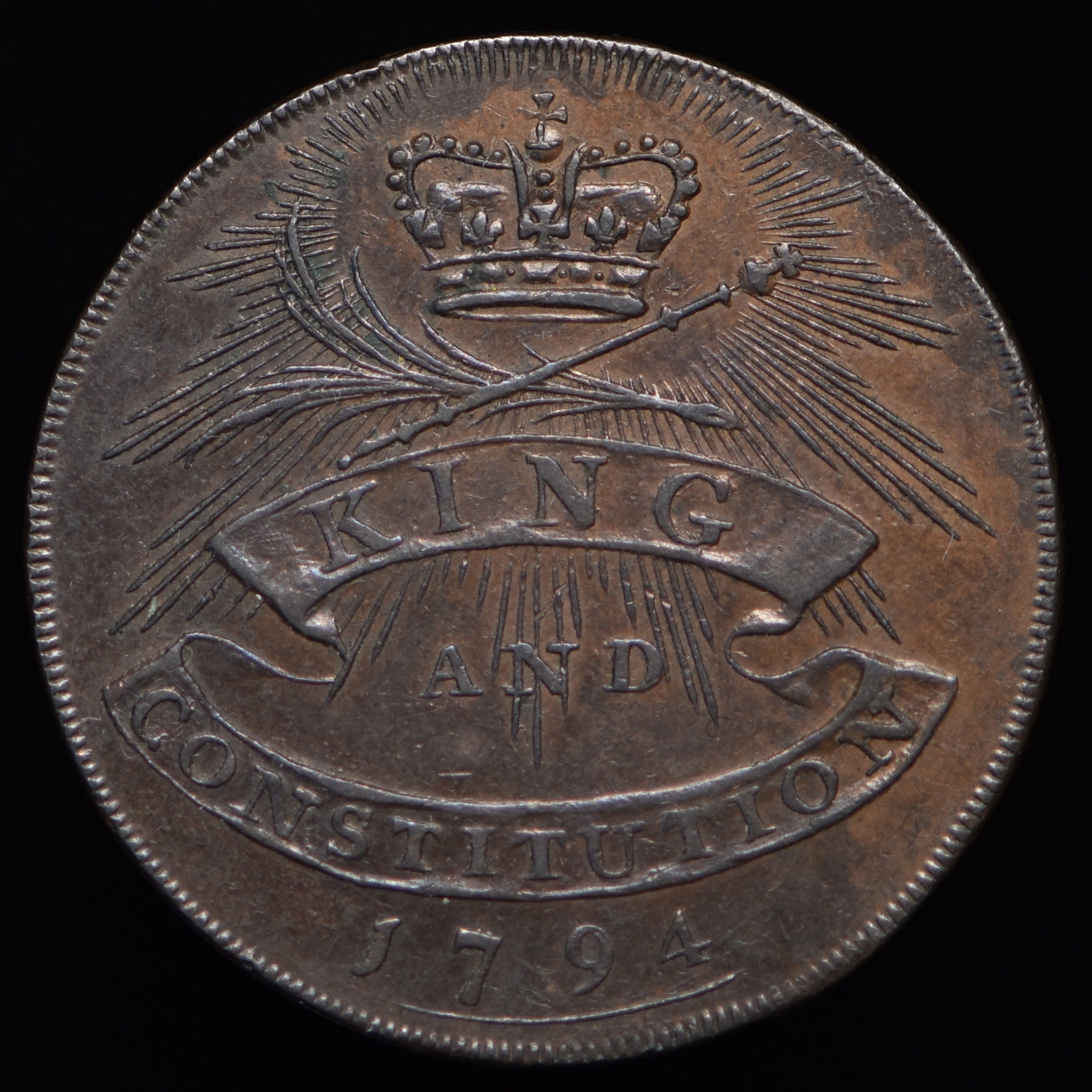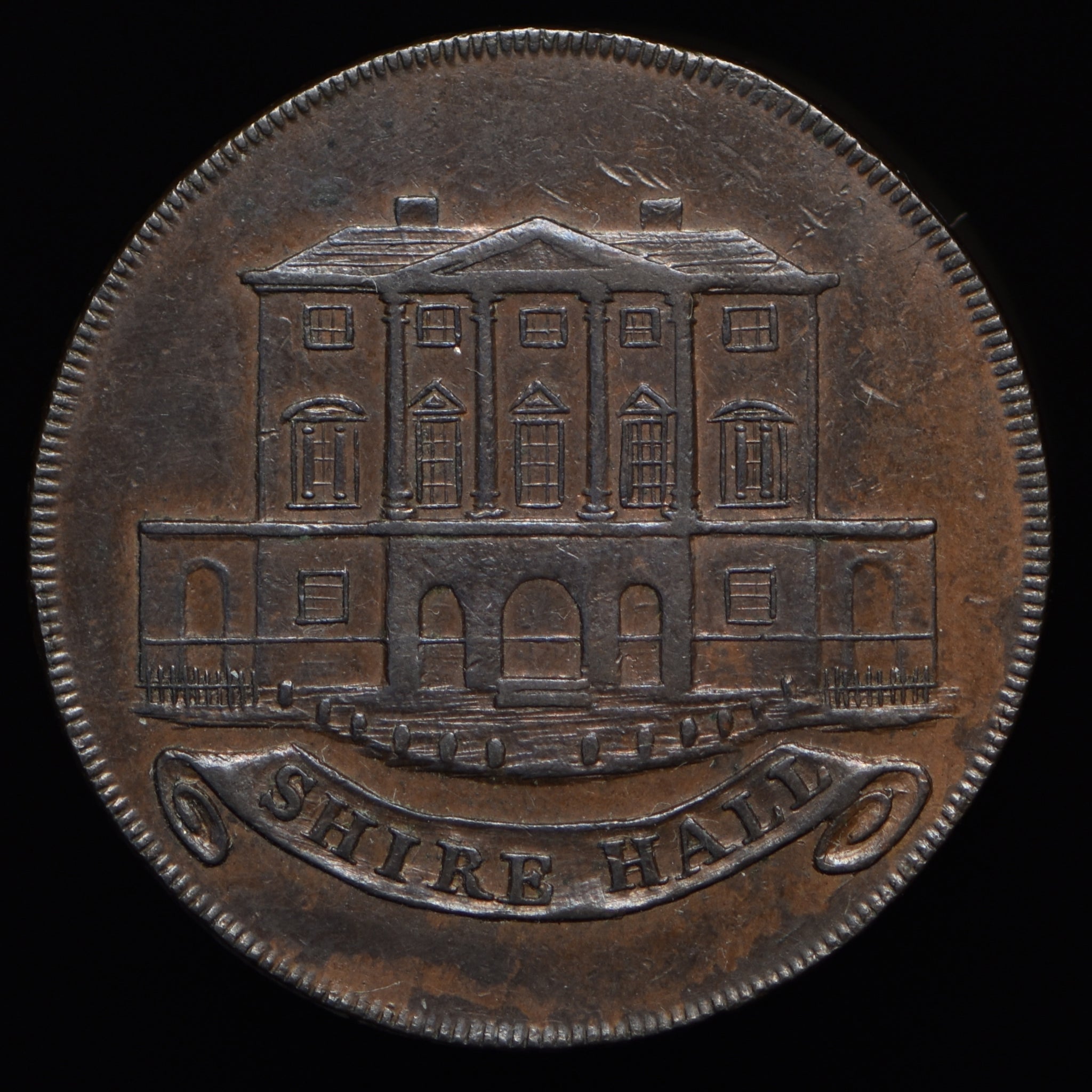 Obv: A building, SHIRE HALL on ribbon below. Rev: A crown, sceptre, and banner inscribed KING AND CONSTITUTION, 1794 below. Edge: PAYABLE AT CLACHAR & CO’S CHELMSFORD ESSEX.