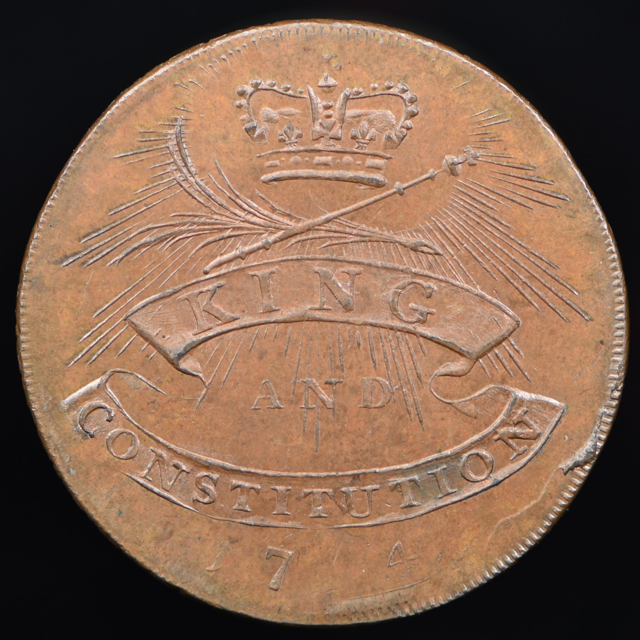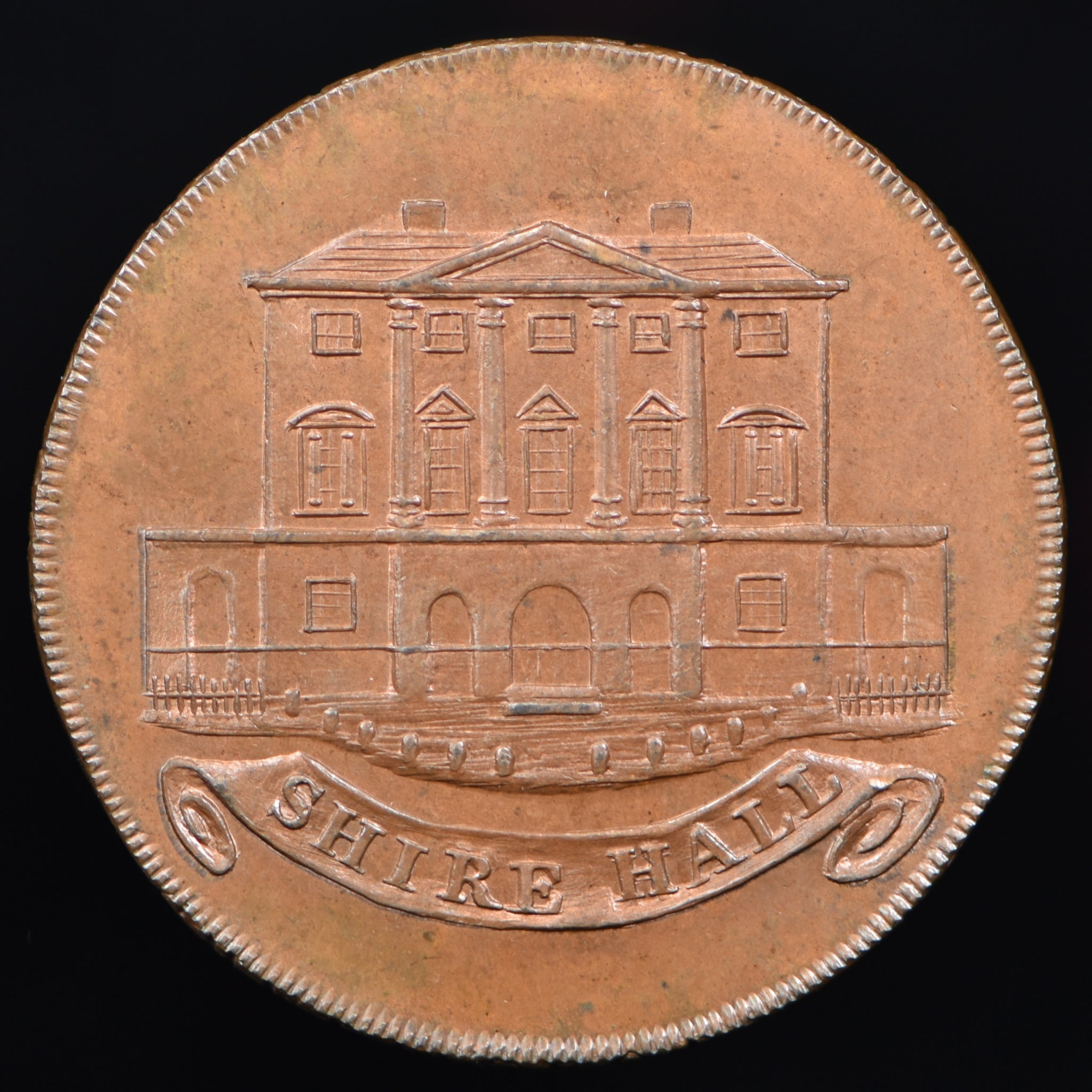Obv: A building, SHIRE HALL on ribbon beneath. Rev: A crown and sceptre, KING AND CONSTITUTION inscribed on banner, 1794 below. Edge: PAYABLE AT CLACHAR & CO’S CHELMSFORD ESSEX.