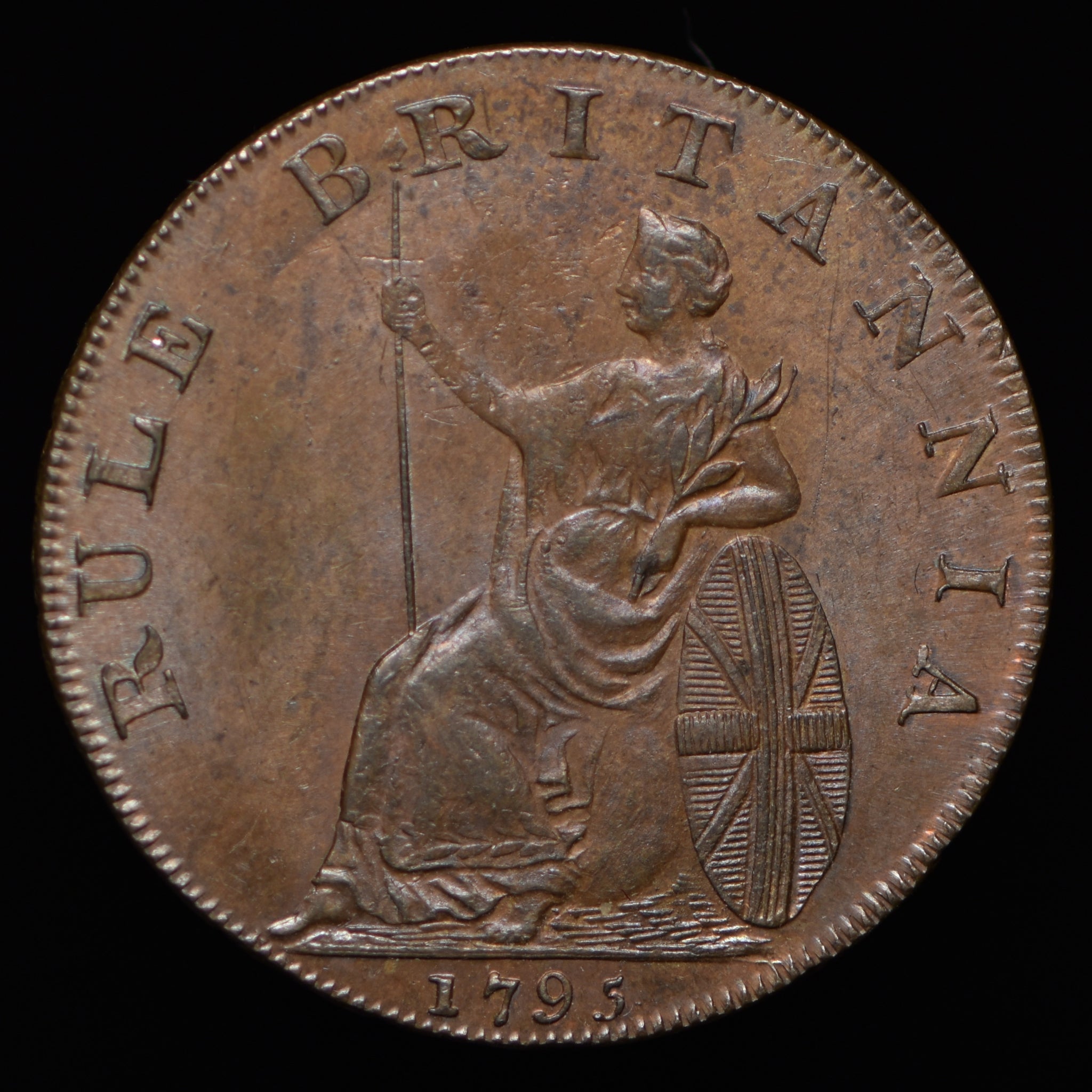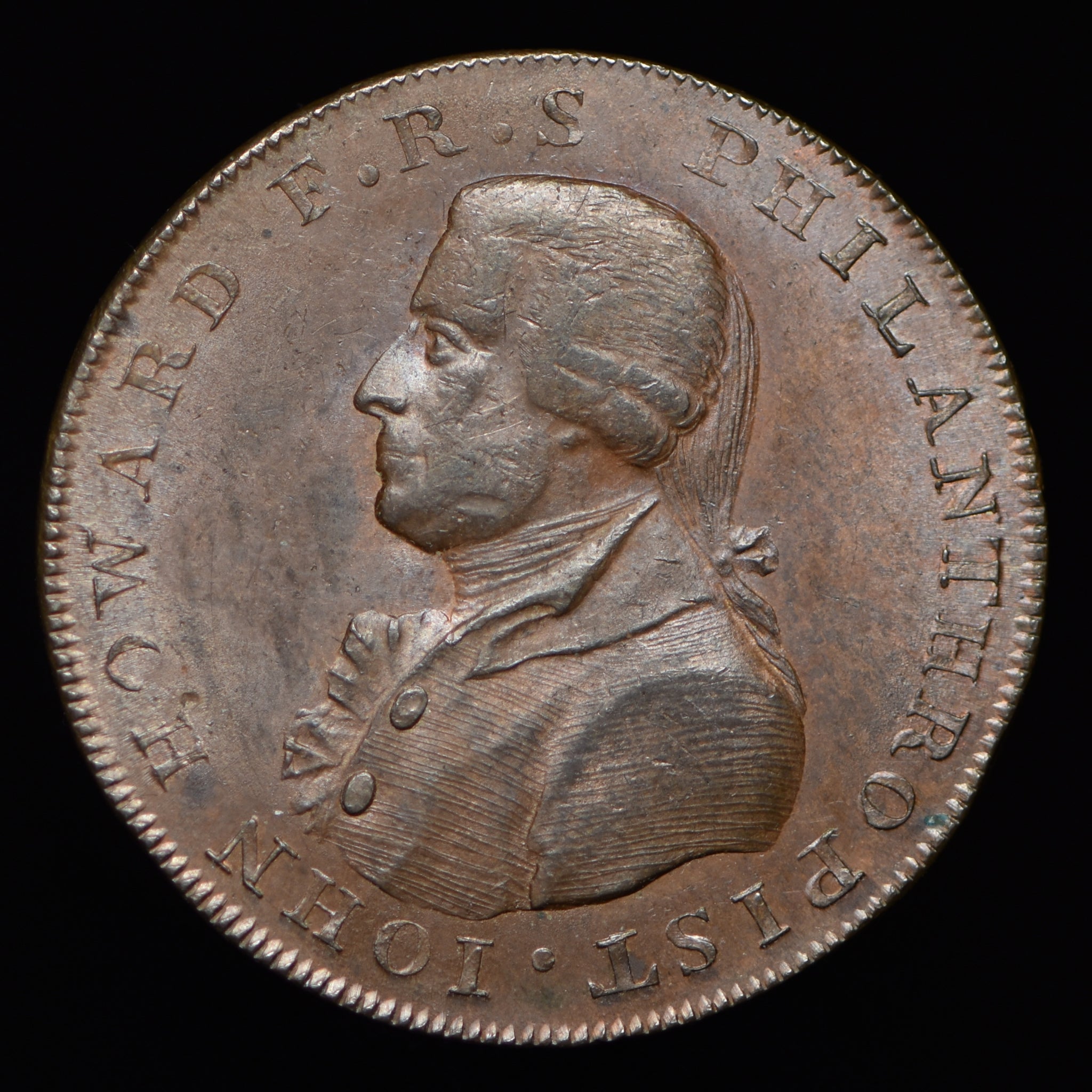 Obv: John Howard bust, JOHN HOWARD F.R.S. PHILANTHROPOST. Rev: Brittania seated, RULE BRITTANIA around, 1795 in exergue. Edge: CURRENT EVERYWHERE.