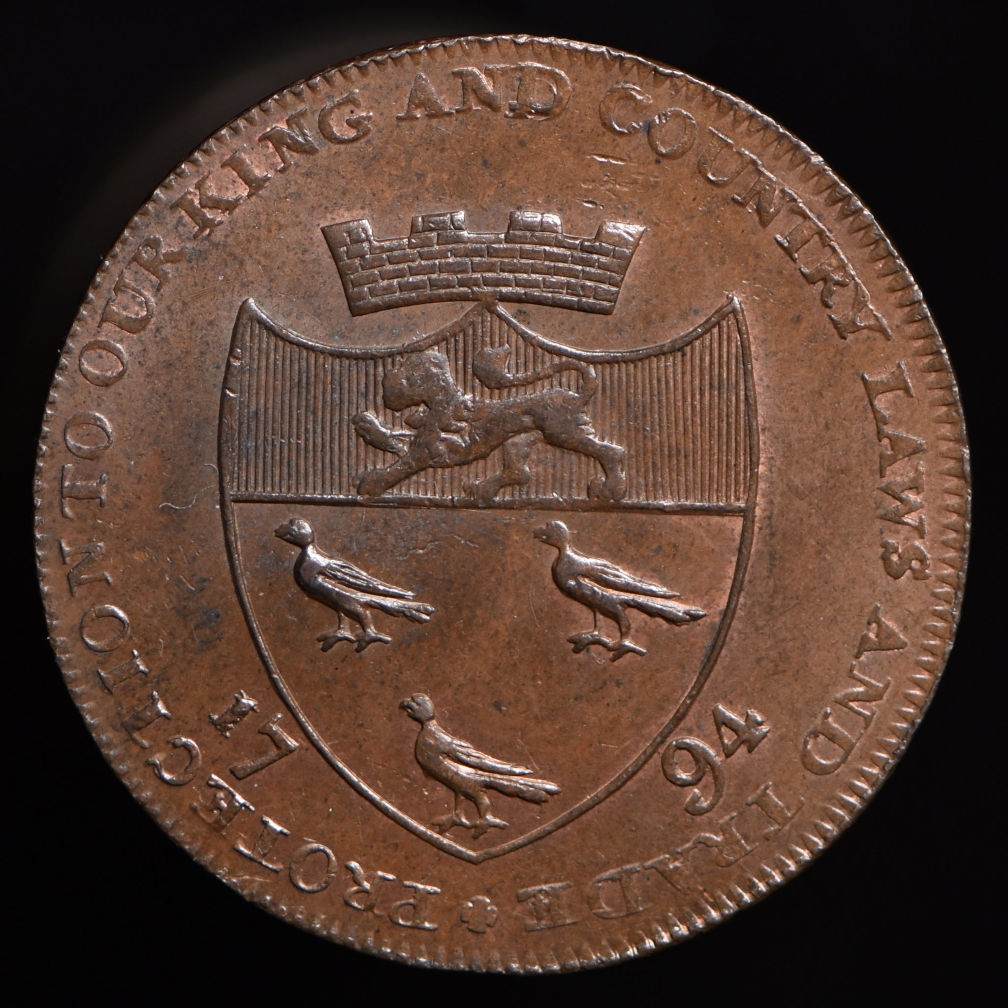 Obv: View of Canterbury Cathedral, UNITY PEACE AND CONCORD: GOOD WILL TO ALL MEN around, CANTERBURY TOKEN in exergue. Rev: Shield of arms of the city of Canterbury, PROTECTION TO OUR KING AND COUNTRY LAWS AND TRADE around. Edge: PAYABLE AT JOHN MATTHEWS + + + +.