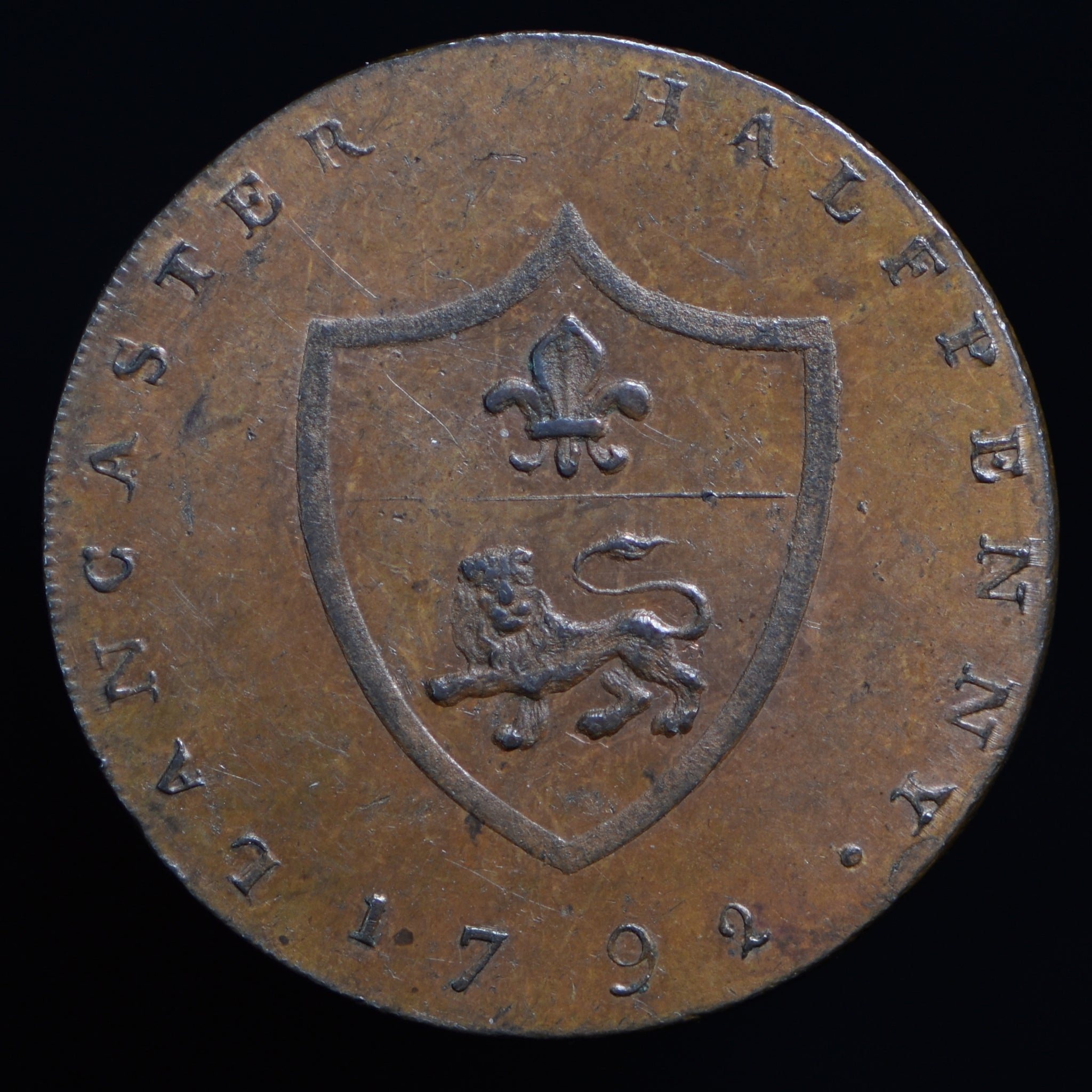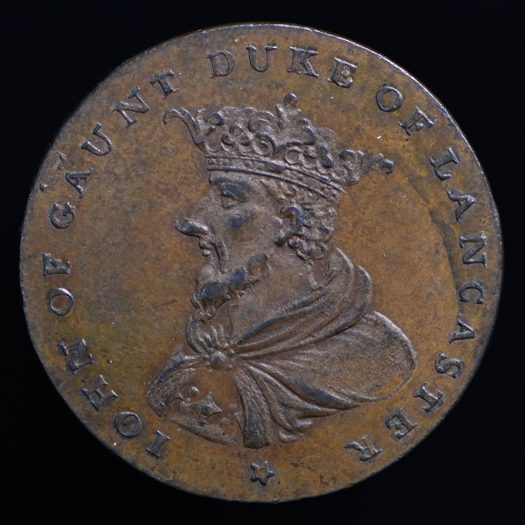 Obv: Bust facing left, IOHN OF GAUNT DUKE OF LANCASTER around. Rev: Shield of arms, LANCASTER HALFPENNY around, 1792 below. Edge: CURRENT EVERY WHERE.