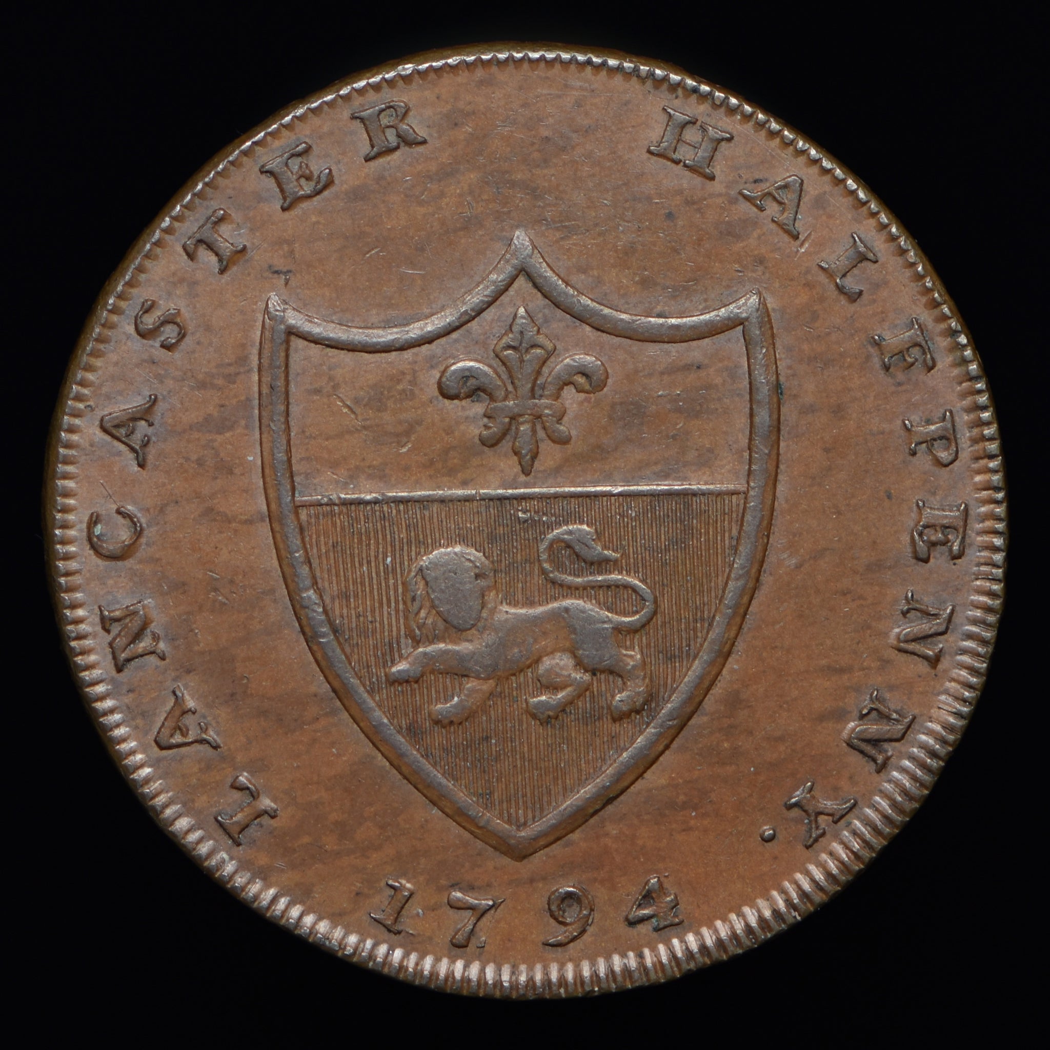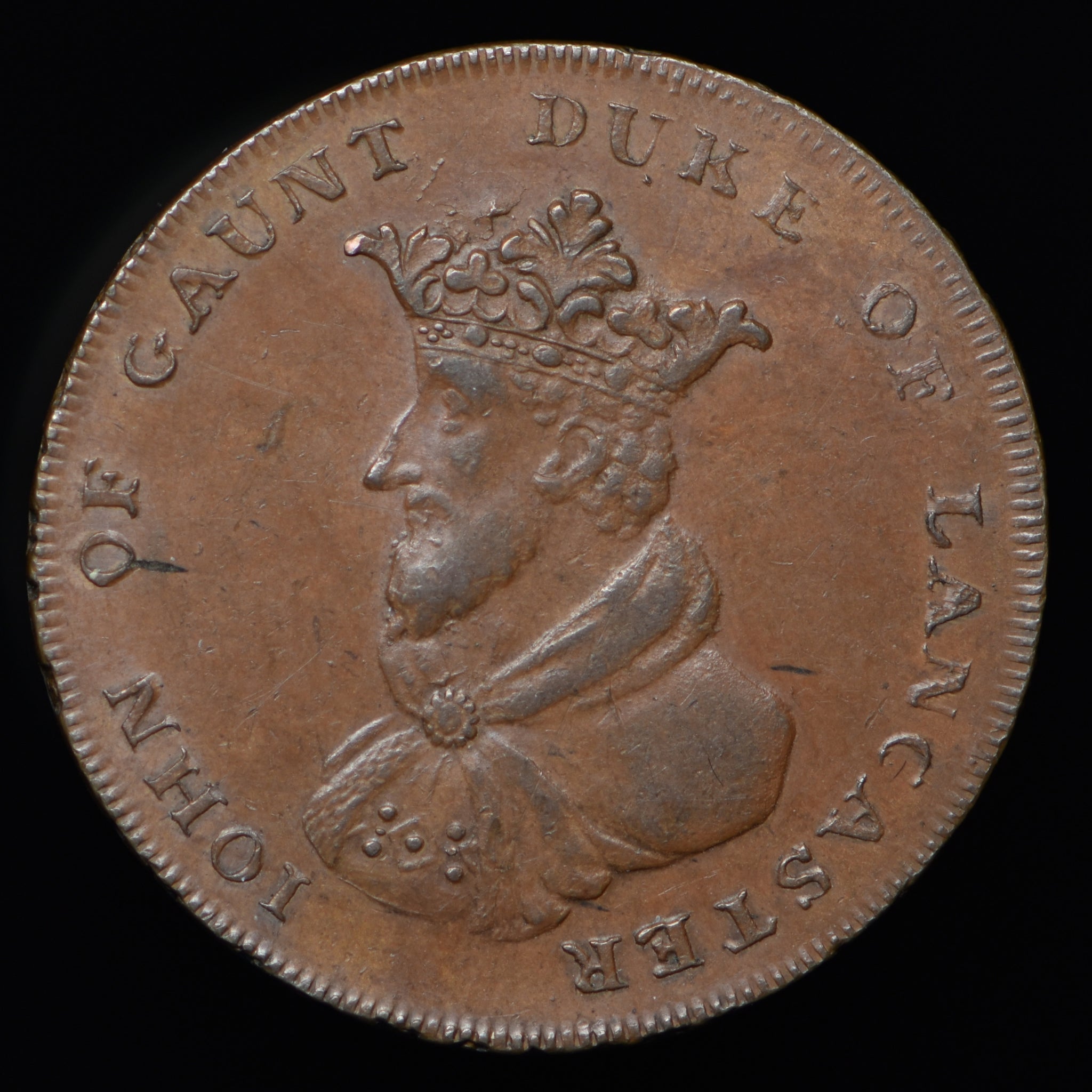 Obv: bust of John of Gaunt, JOHN OF GAUNT DUKE OF LANCASTER around, no star under bust. Rev: Shield of Arms, LANCASTER HALFPENNY around, 1794 below. Edge: PAYABLE IN LANCASTER LONDON OR BRISTOL.