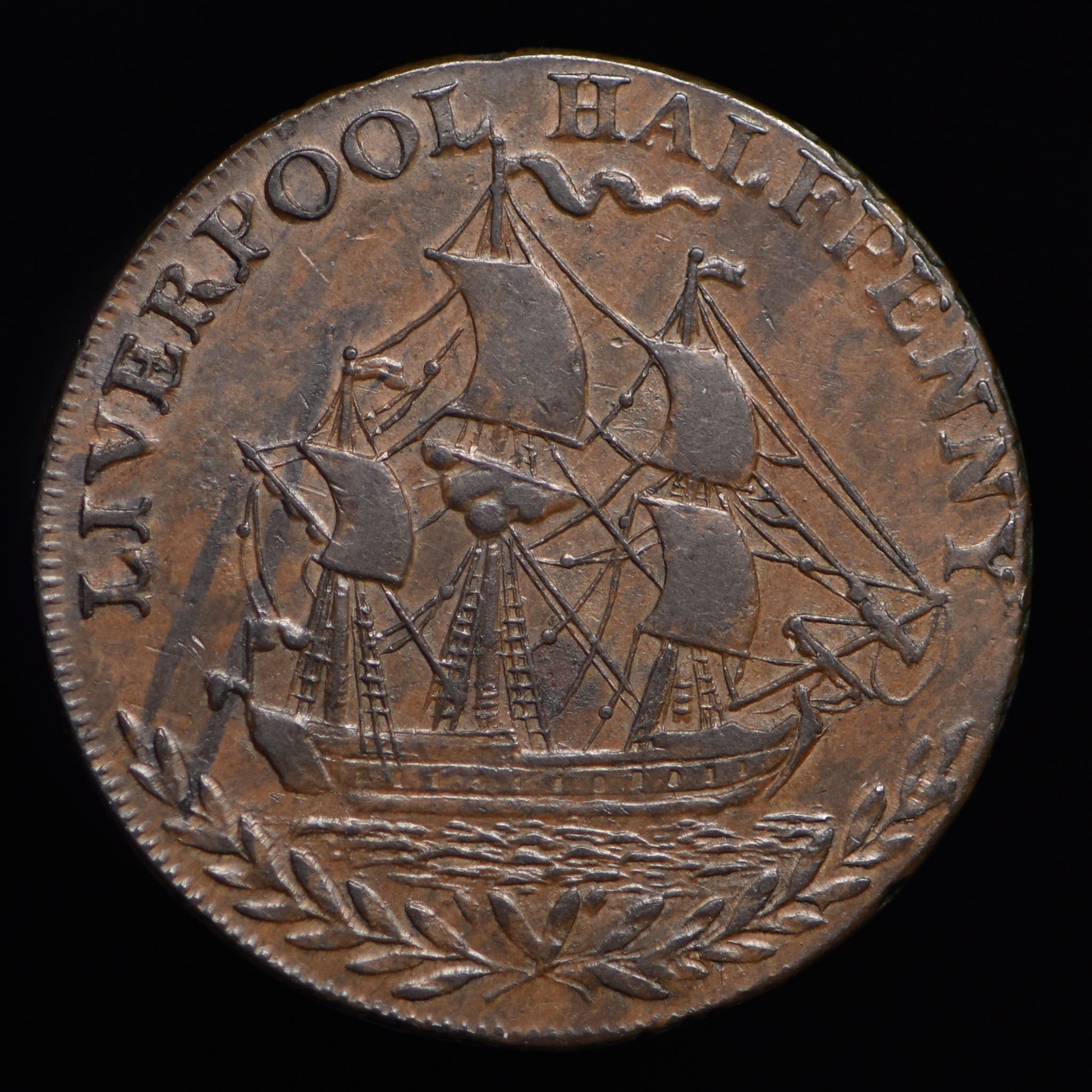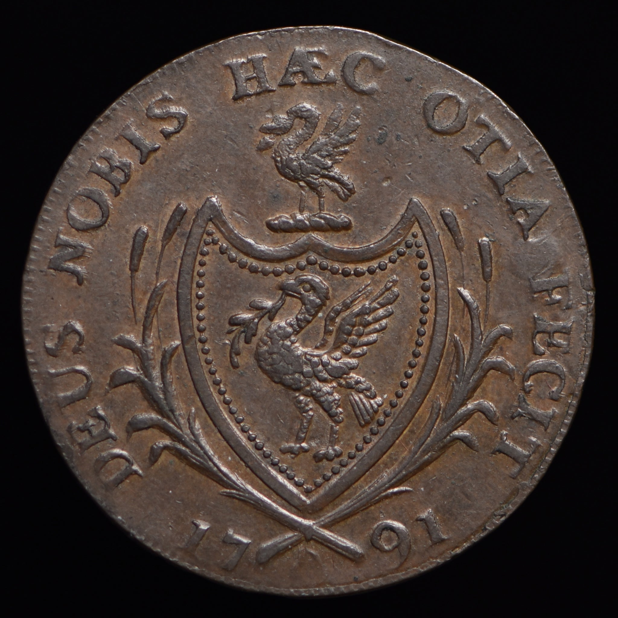 Obv: Ship sailing right, LIVERPOOL HALFPENNY above. Rev: Arms of Liverpool, crest a liver bird (cormorant), DEUS NOBIS HAEC OTIA FECIT around, 1791 below. Edge: PAYABLE AT LONDON OR ANGLESEA.