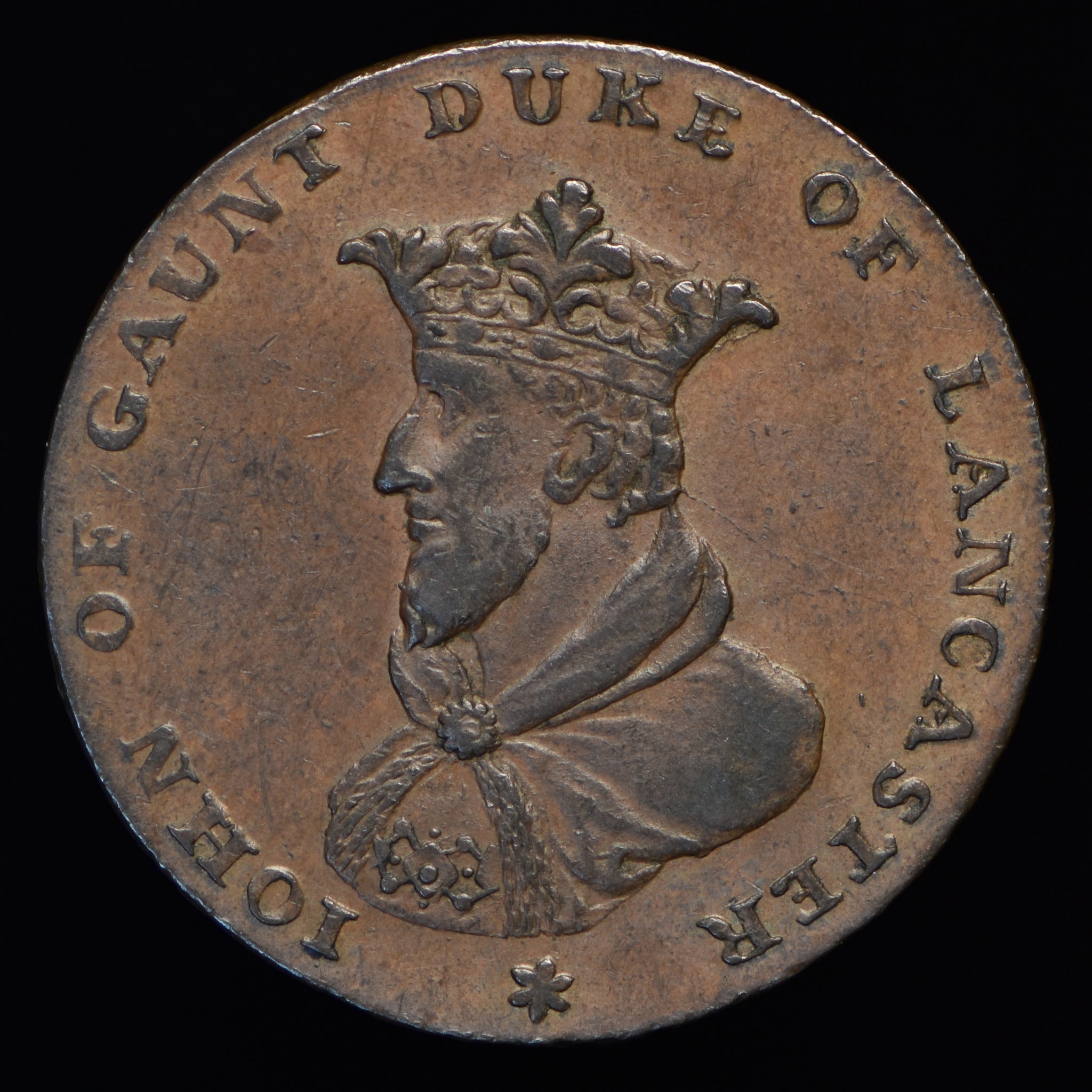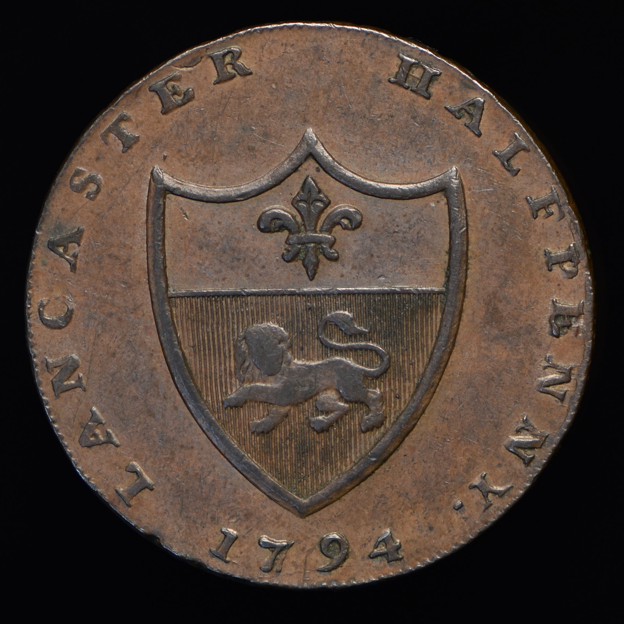 Obv: bust of John of Gaunt, JOHN OF GAUNT DUKE OF LANCASTER around, star below. Rev: Shield of Arms, LANCASTER HALFPENNY around, 1794 below. Edge: PAYABLE IN LANCASTER LONDON OR BRISTOL.