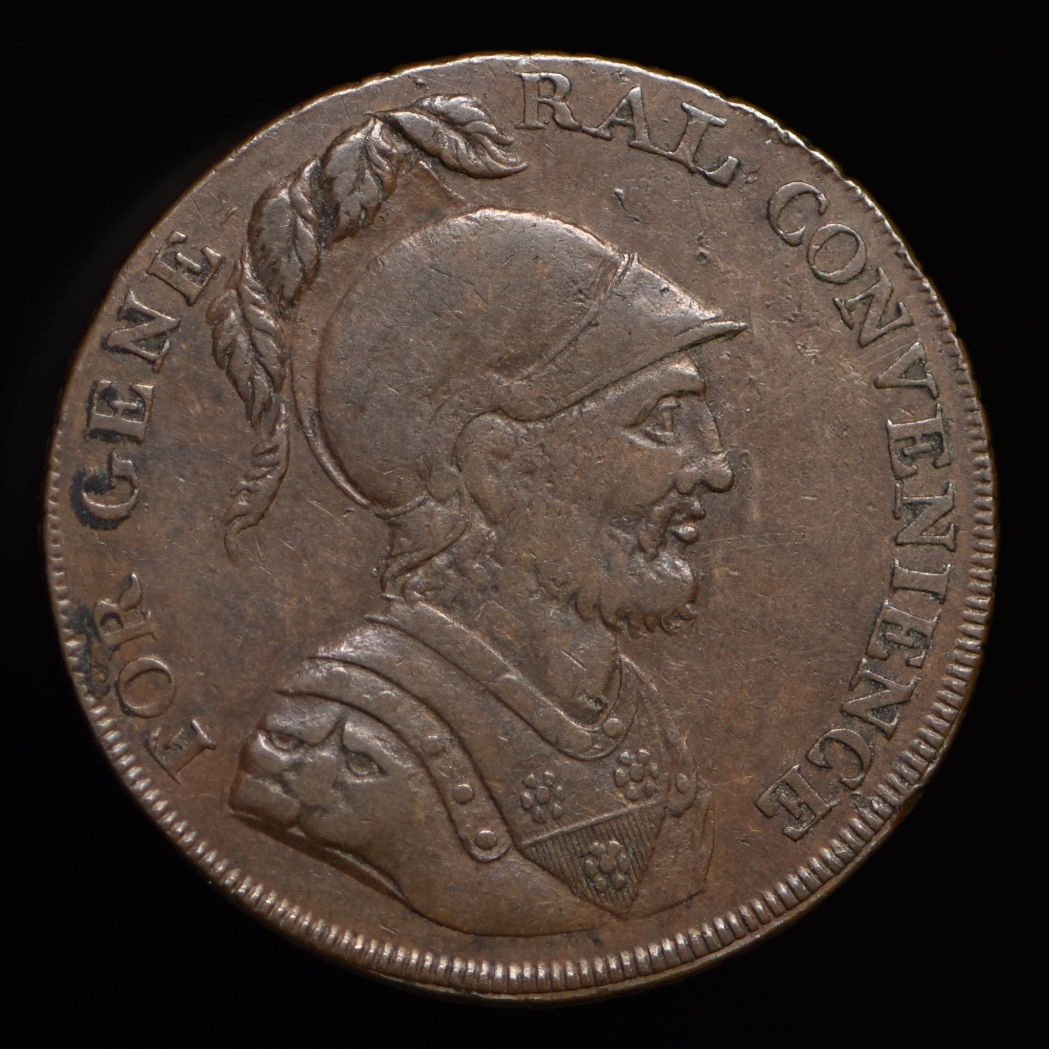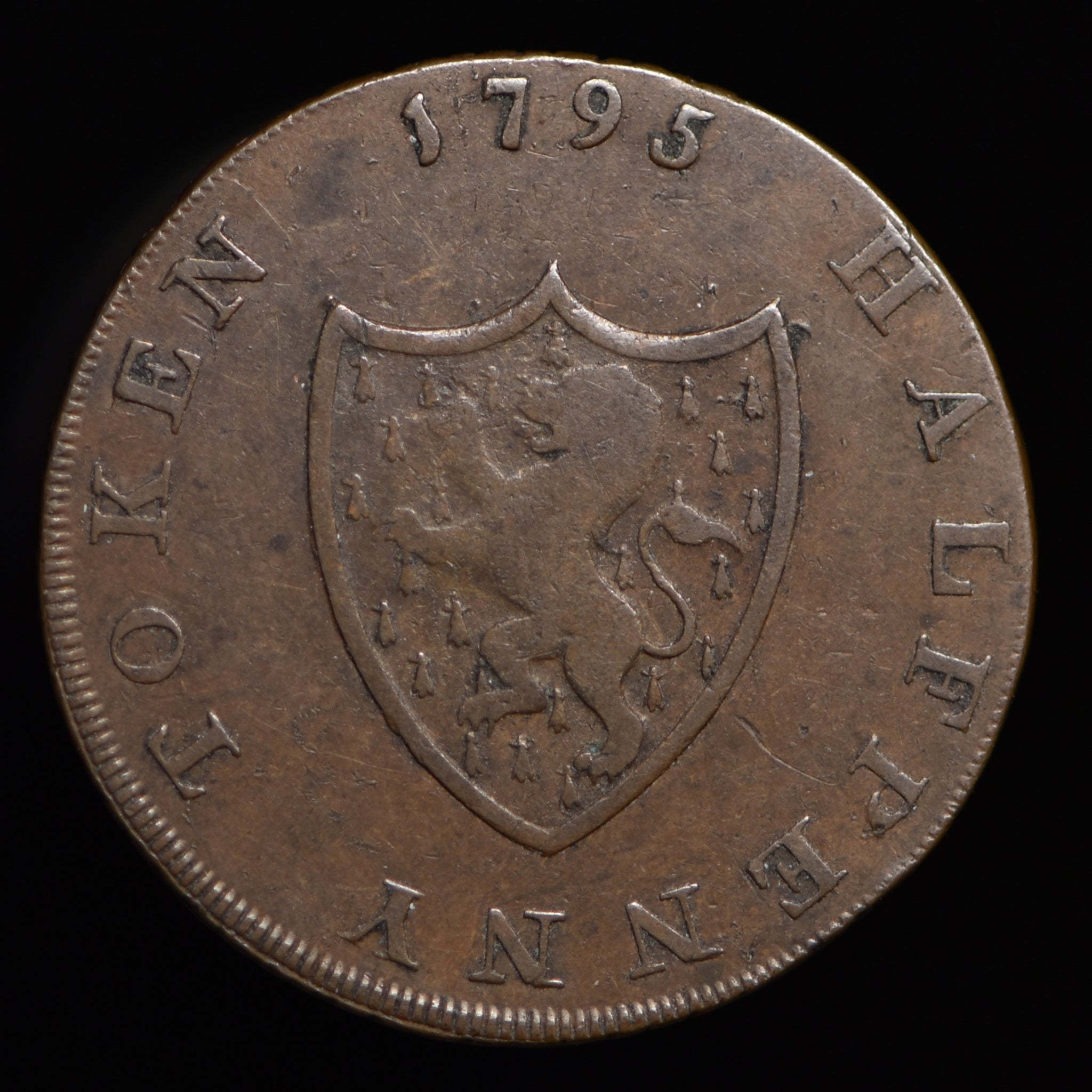Obv: Helmed bust facing right, FOR GENERAL CONVENIENCE around. Rev: Shield of arms, HALFPENNY TOKEN around, 1795 above. Edge: PAYABLE IN LONDON, remainder engrailed.