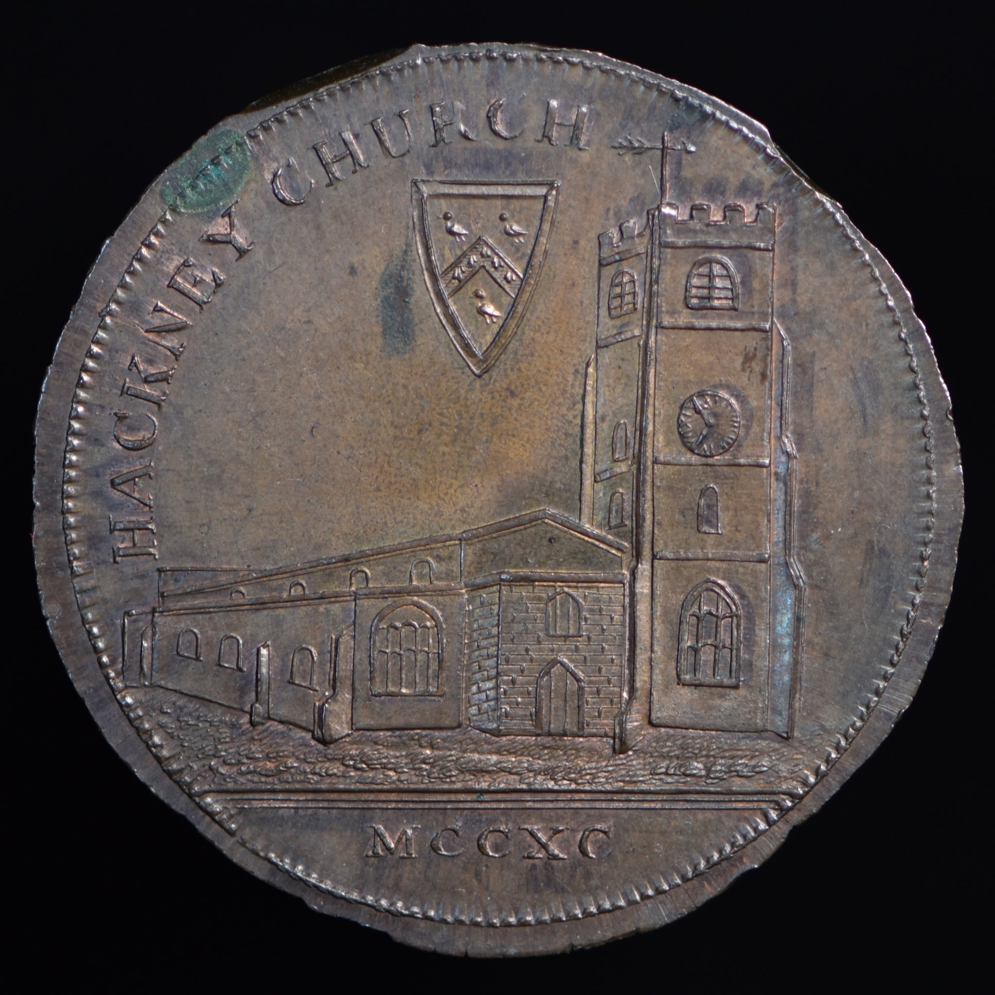 Obv: View of church, HACKNEY CHURCH above with shield of arms, MCCXC below. Rev: A cypher D A R with laurel wreath above, knife and palm branch below, HACKNEY PROMISSORY TOKEN around, 1795 below. Edge: Plain (not in collar).