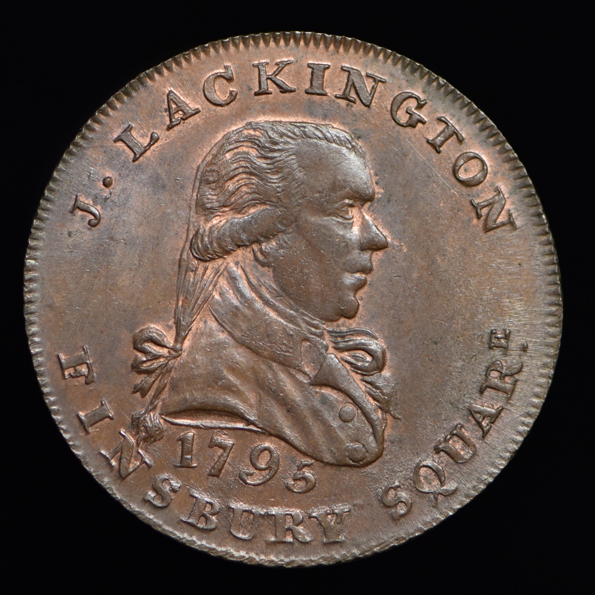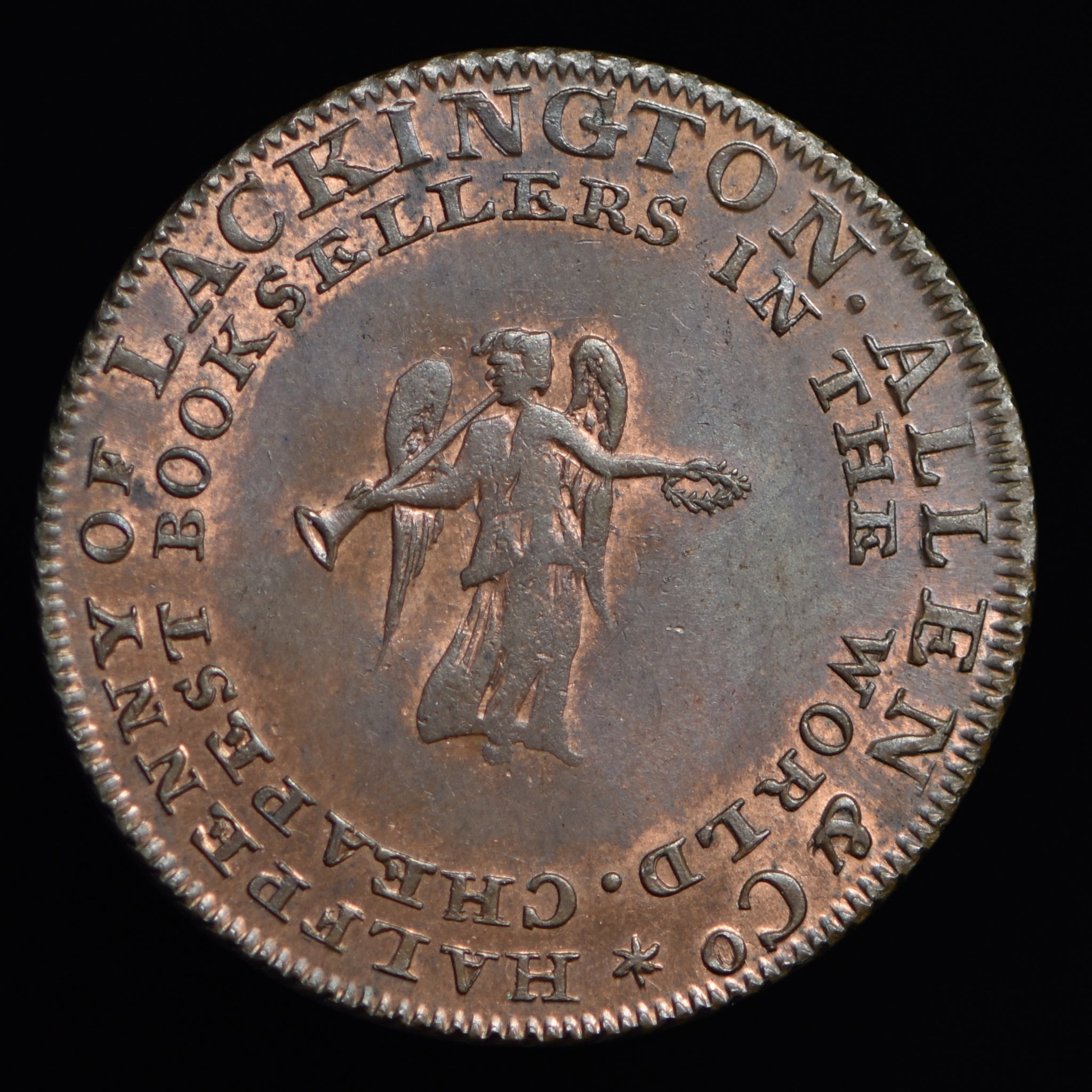 Obv: Bust facing right, J. LACKINGTON above, 1795 FINSBURY SQUARE below. Rev: Fame blowing a trumpet in center, HALFPENNY OF LACKINGTON. ALLEN & CO CHEAPEST BOOKSELLERS IN THE WORLD. (In two circles around). Edge: Milled to left.