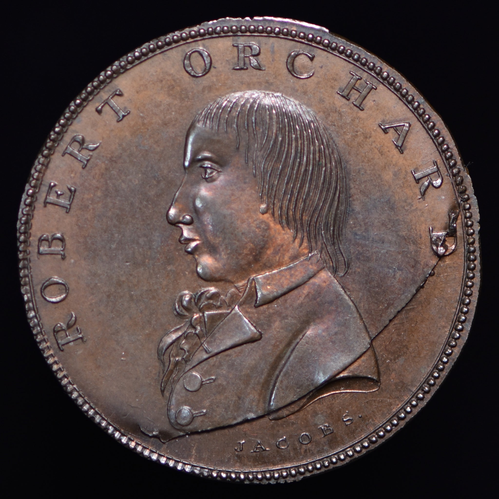 Obv: Bust of Orchard facing left, ROBERT ORCHARD around, JACOBS below. Rev: Doves and Wheatsheaf, PEACE AND PLENTY around, HALFPENNY below. Edge: Plain.