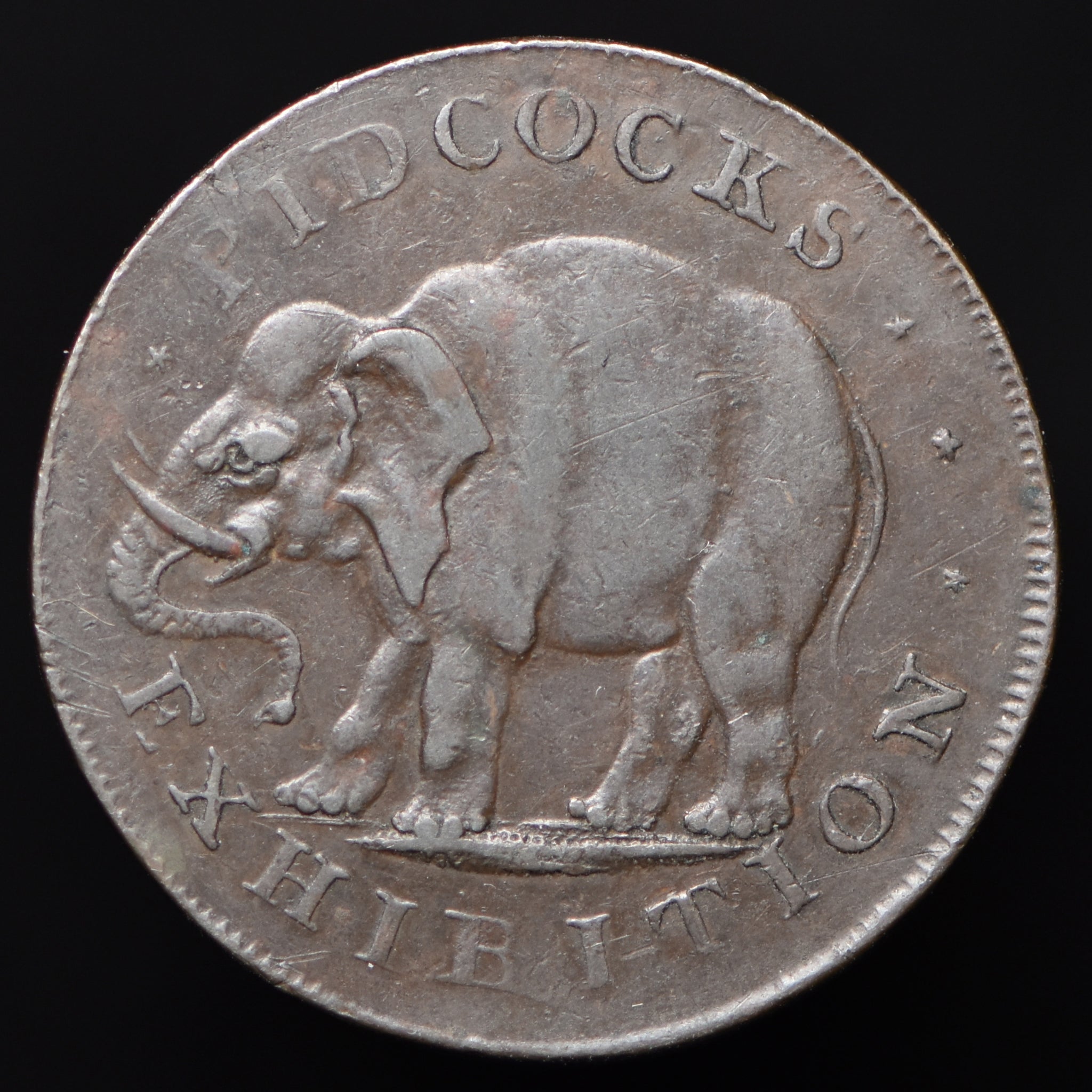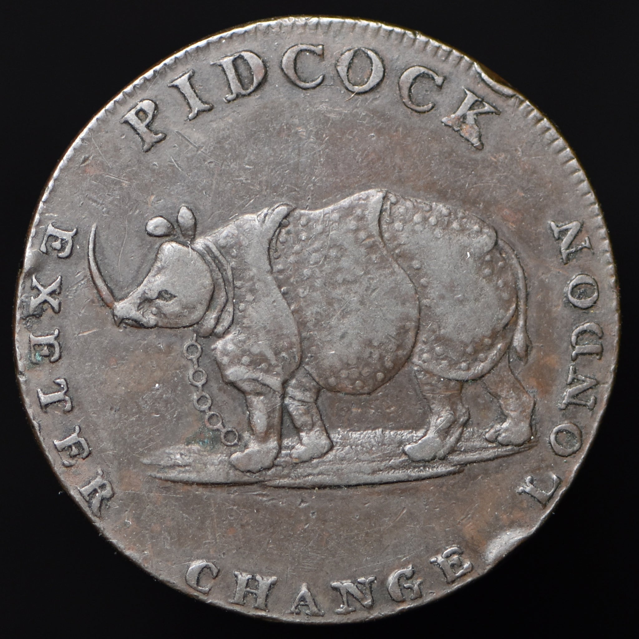 Obv: An elephant, PIDCOCKS EXHIBITION around. Rev: A rhino facing left, PIDCOCK above, EXETER CHANGE LONDON around. Edge: Plain.