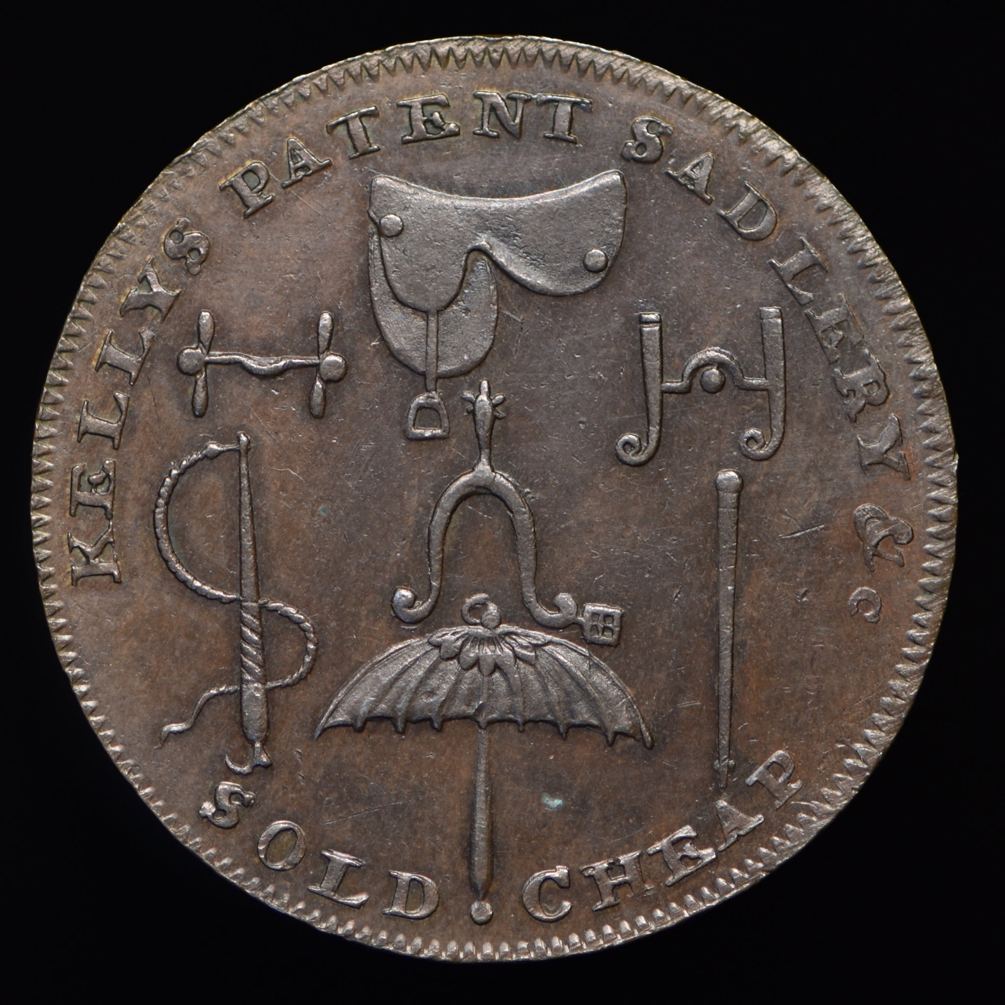 Obv: A postilion holding a harnessed horse, KELLY'S LIGHT HARNESS & C. around, SOLD CHEAP AT THEIR MANUFACTORY STRAND LONDON in exergue. Rev: A saddle, spur, & c. KELLYS PATENT SADLERY & C. around, SOLD CHEAP below. Edge: PAYABLE AT LONDON.