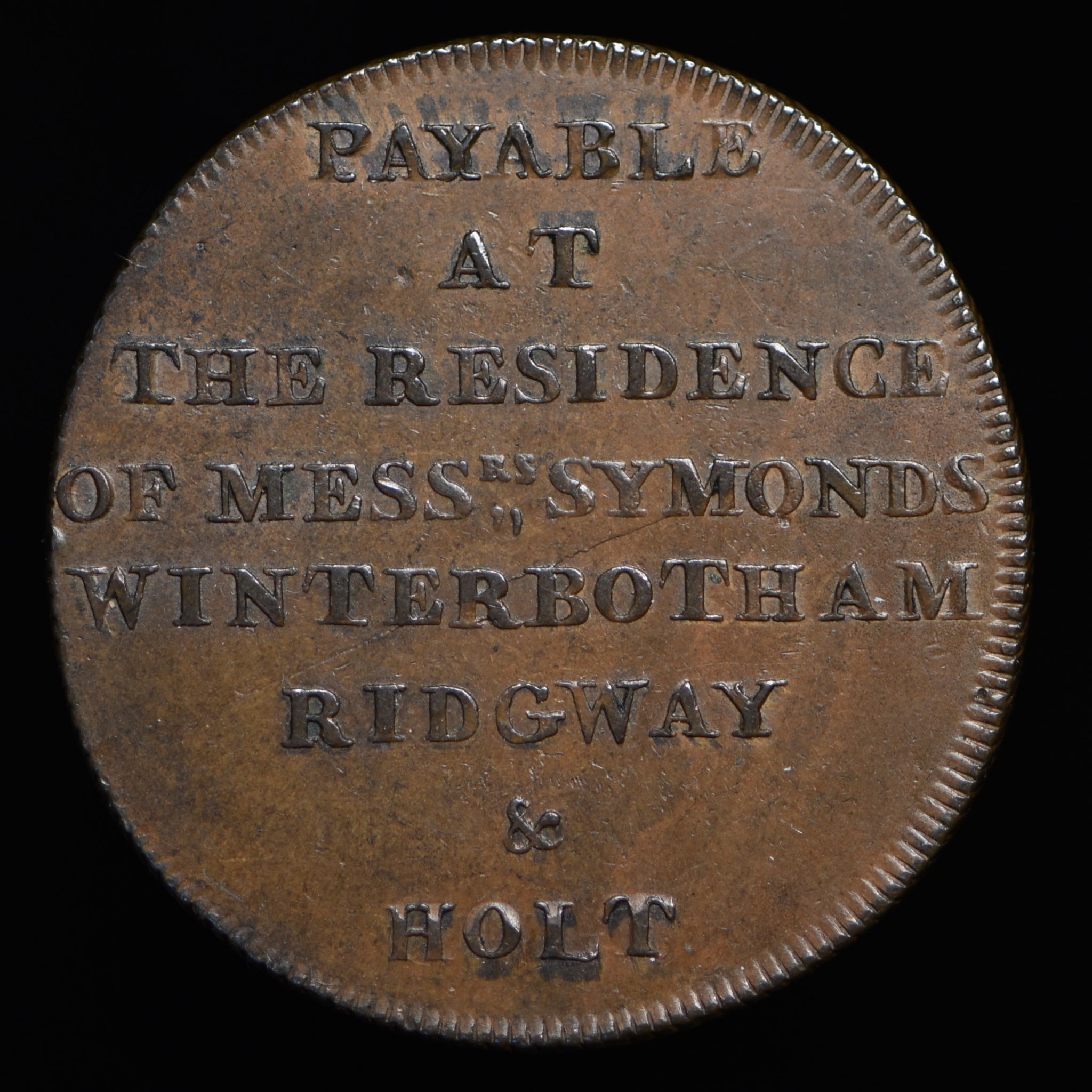 Obv: Front view of a prison, NEWGATE above, MDCCXCIV below. Rev: PAYABLE AT THE RESIDENCE OF MESSrs. SYMONDS WINTERBOTHAM RIDGWAY & HOLT. Edge: Milled.