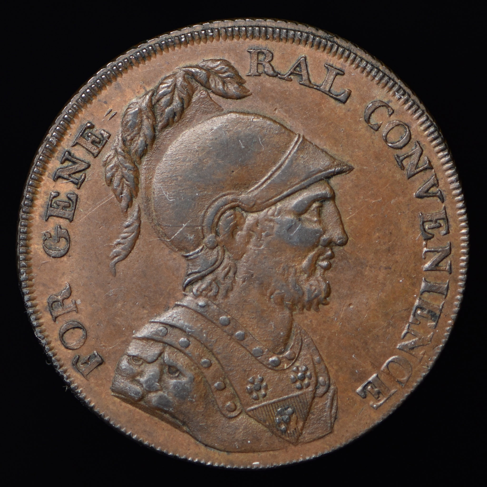 Obv: Helmed bust to right, FOR GENERAL CONVENIENCE around. Rev: Shield of arms, HALFPENNY TOKEN 1795 around. Edge: Milled.