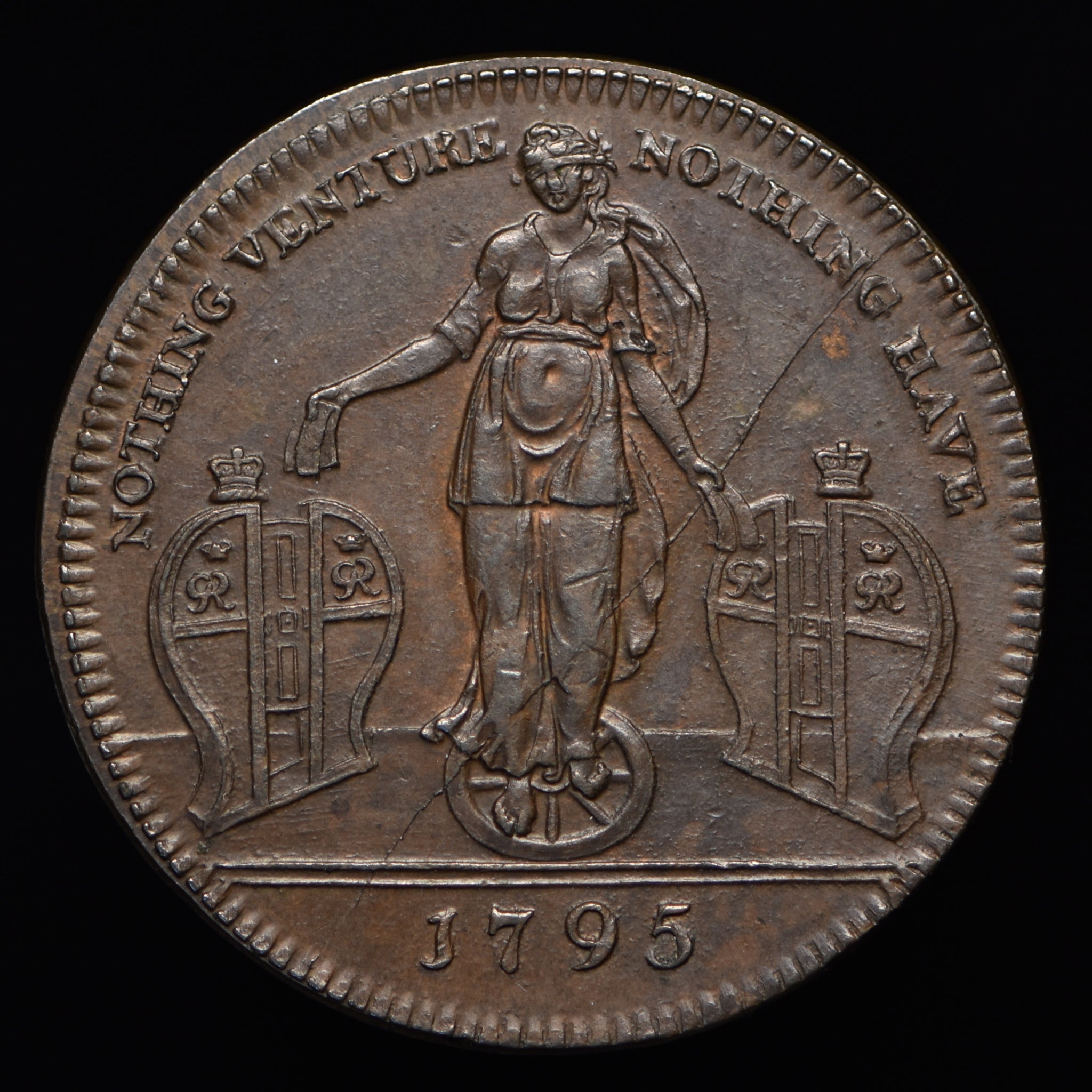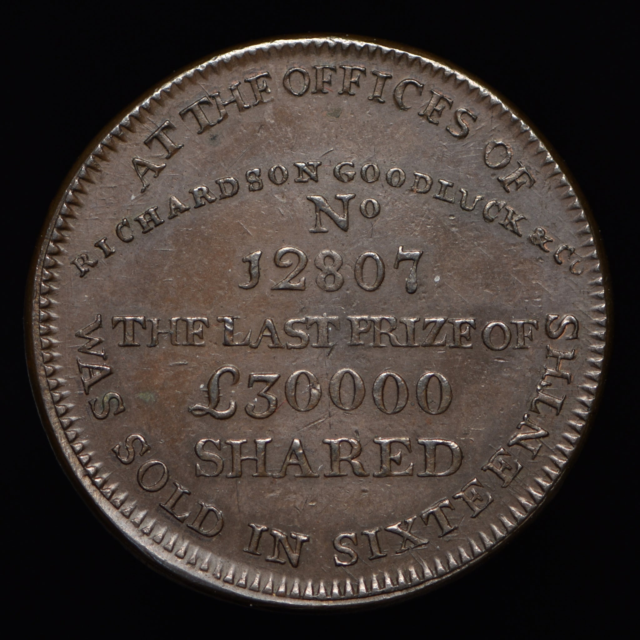 Obv: A figure of Fortune standing between two lottery wheels, NOTHING VENTURE NOTHING HAVE around, 1795 in exergue. Rev: AT THE OFFICES OF RICHARDSON GOODLUCK & CO NO 12807 THE LAST PRIZE OF 30000 SHARED WAS SOLD IN SIXTEENTHS.