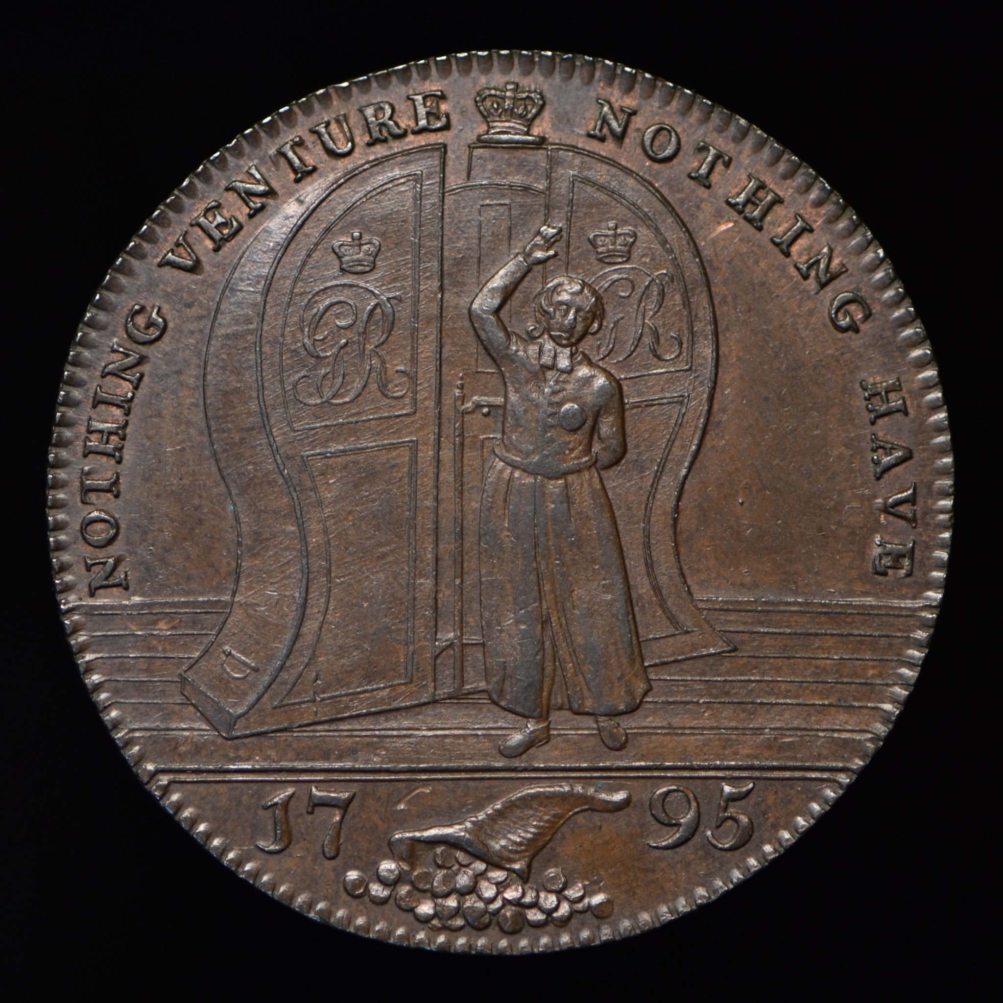 Obv: A bluecoat boy preparing to draw from a lottery wheel, NOTHING VENTURE NOTHING HAVE around, 1795 in exergue divided by cornucopia of money. Rev: RICHARDSON GOODLUCK & CO. SOLD NO 12807 THE LAST PRIZE OF £30000 SHARED IN SIXTEENTHS.