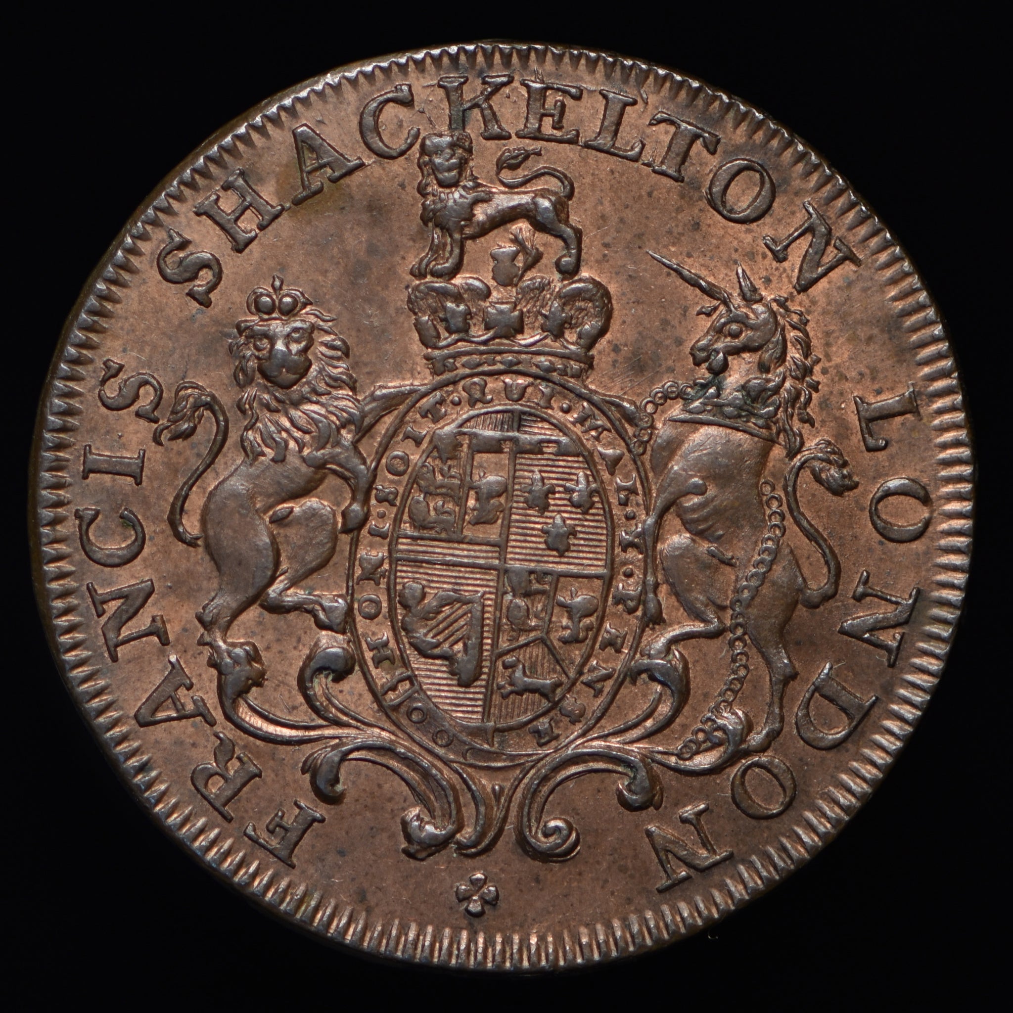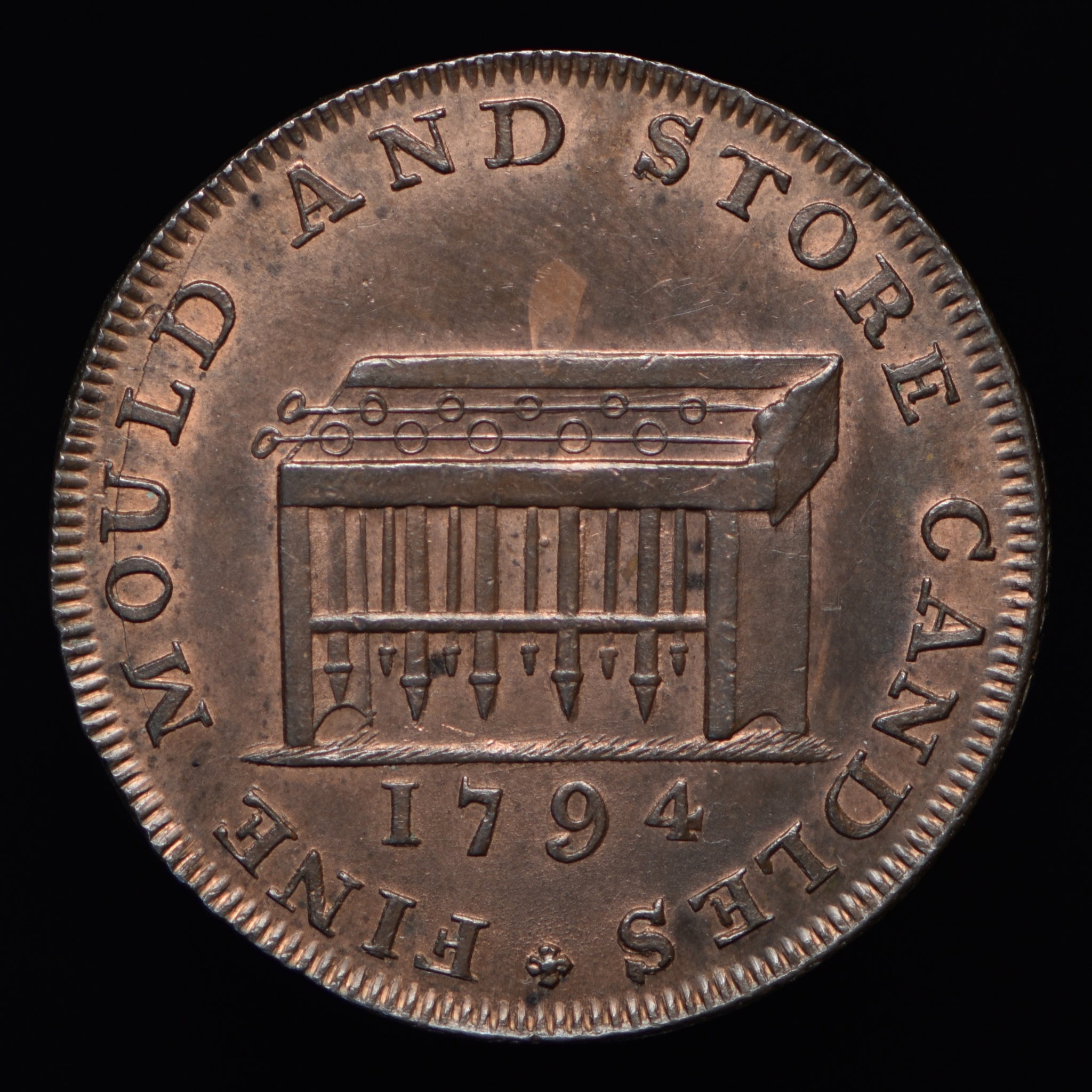Obv: The royal arms, crest, & c., FRANCIS SHACKELTON LODON around. Rev: A candle mould, FINE MOULD AND STORE CANDLES around, 1794 below mould. Edge: PAYABLE IN DUBLIN OR LONDON .+.+.