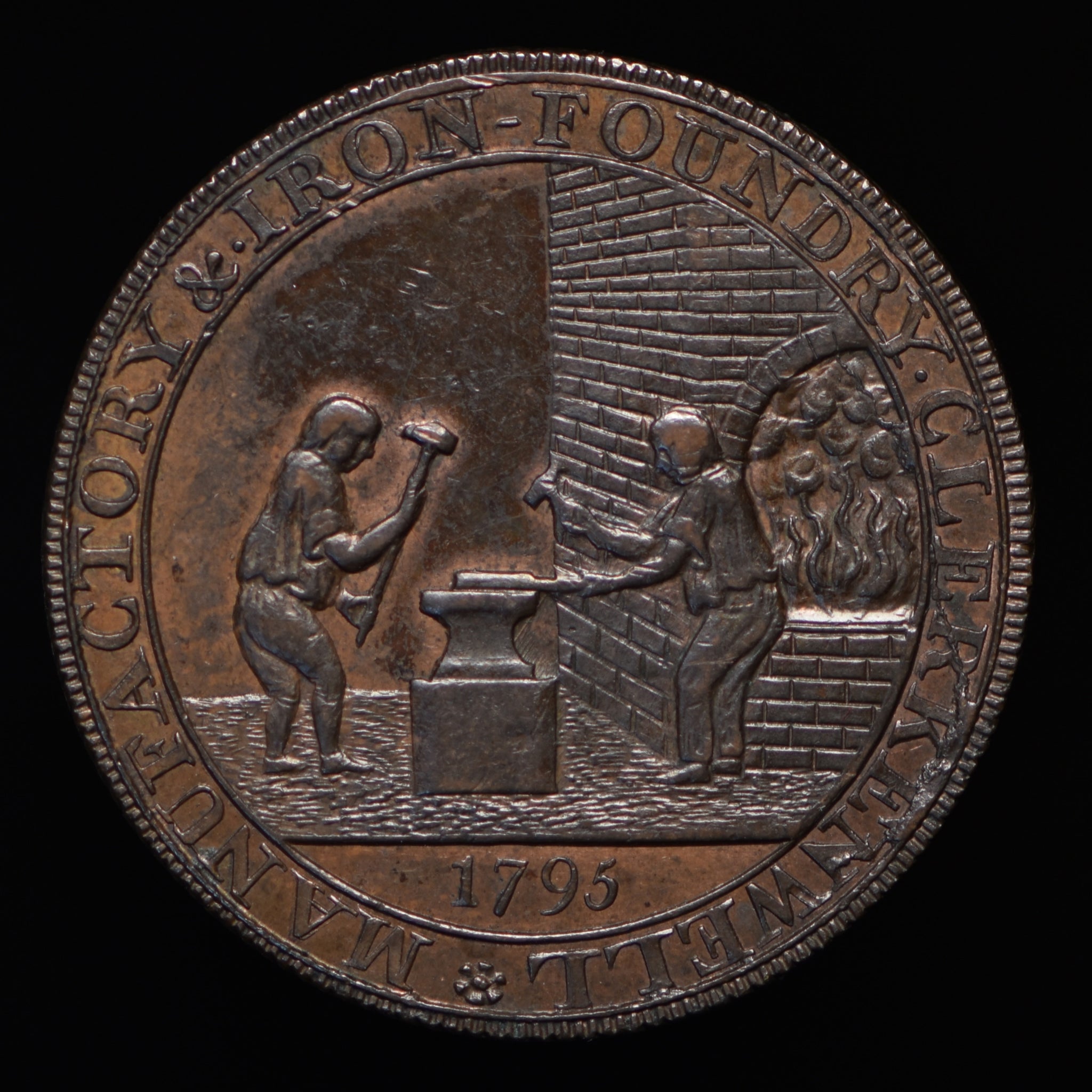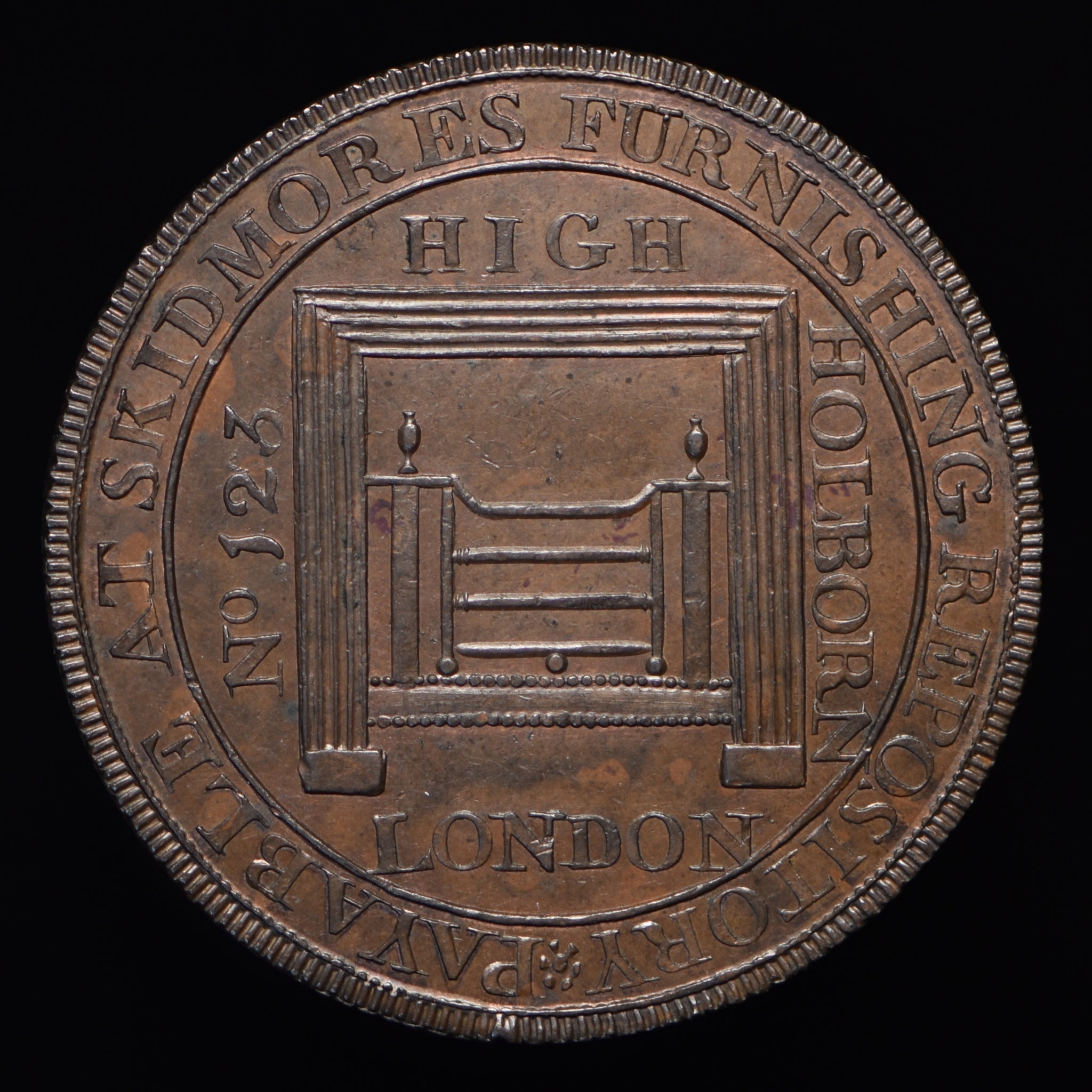 Obv: A register stove, NO 123 HIGH HOLBORN LONDON within a circle, PAYABLE AT SKIDMORES FURNISHING REPOSITORY around. Rev: Two men at a forge. MANUFACTORY & IRON FOUNDRY CLERKENWELL around. 1795 in exergue. Edge: Milled.