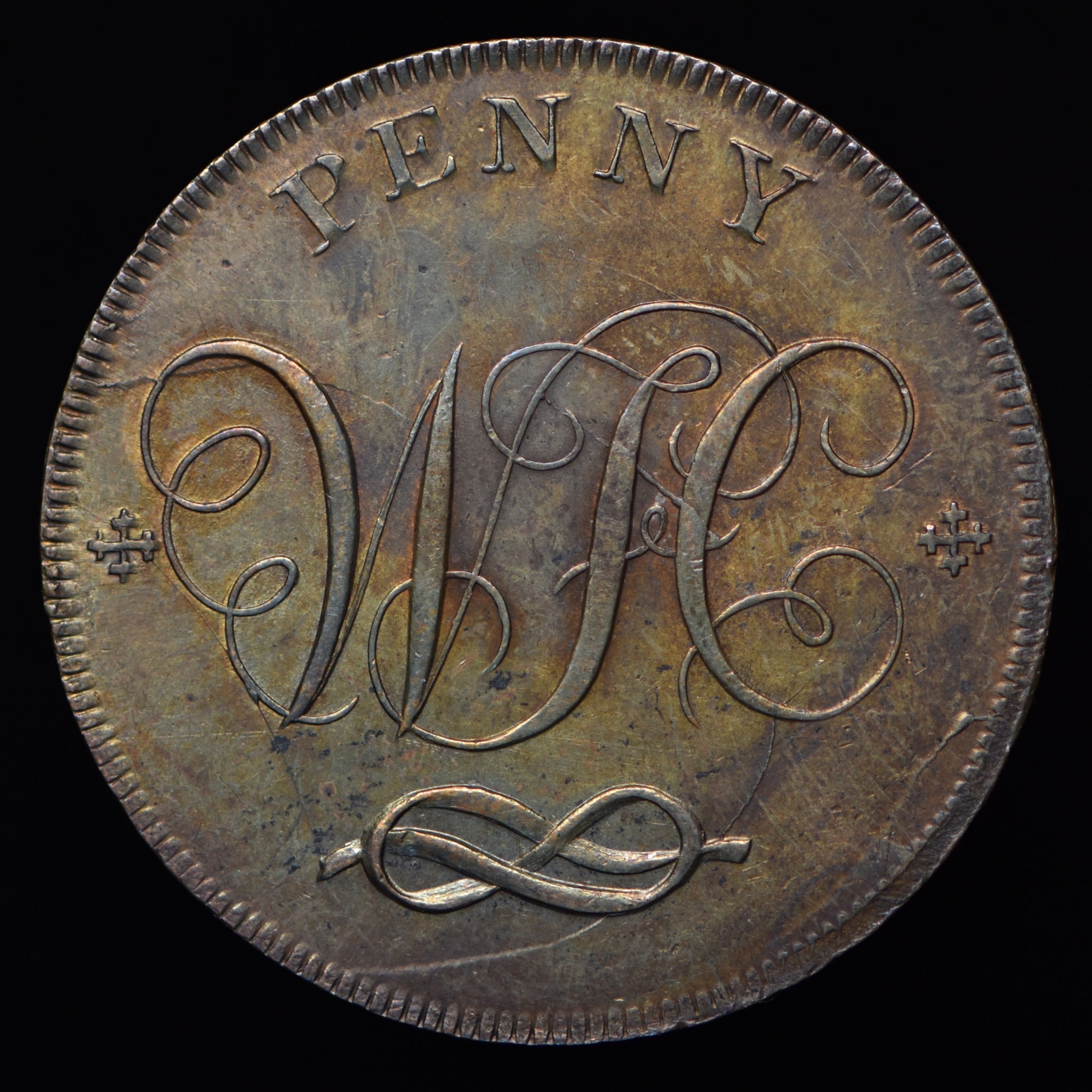Obv: Arms of Stafford, STAFFORD above, 1801 below. Rev: A cypher W H, Staffordshire knot below. Edge: PAYABLE AT HORTON AND COMPANY.