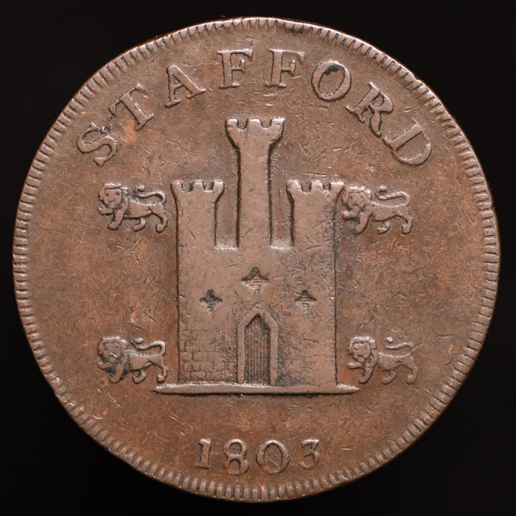 Obv: Arms of Stafford, STAFFORD above, 1803 below. Rev: A cypher W H, PENNY above, Staffordshire knot below. Edge: PAYABLE BY HORTON AND COMPANY.