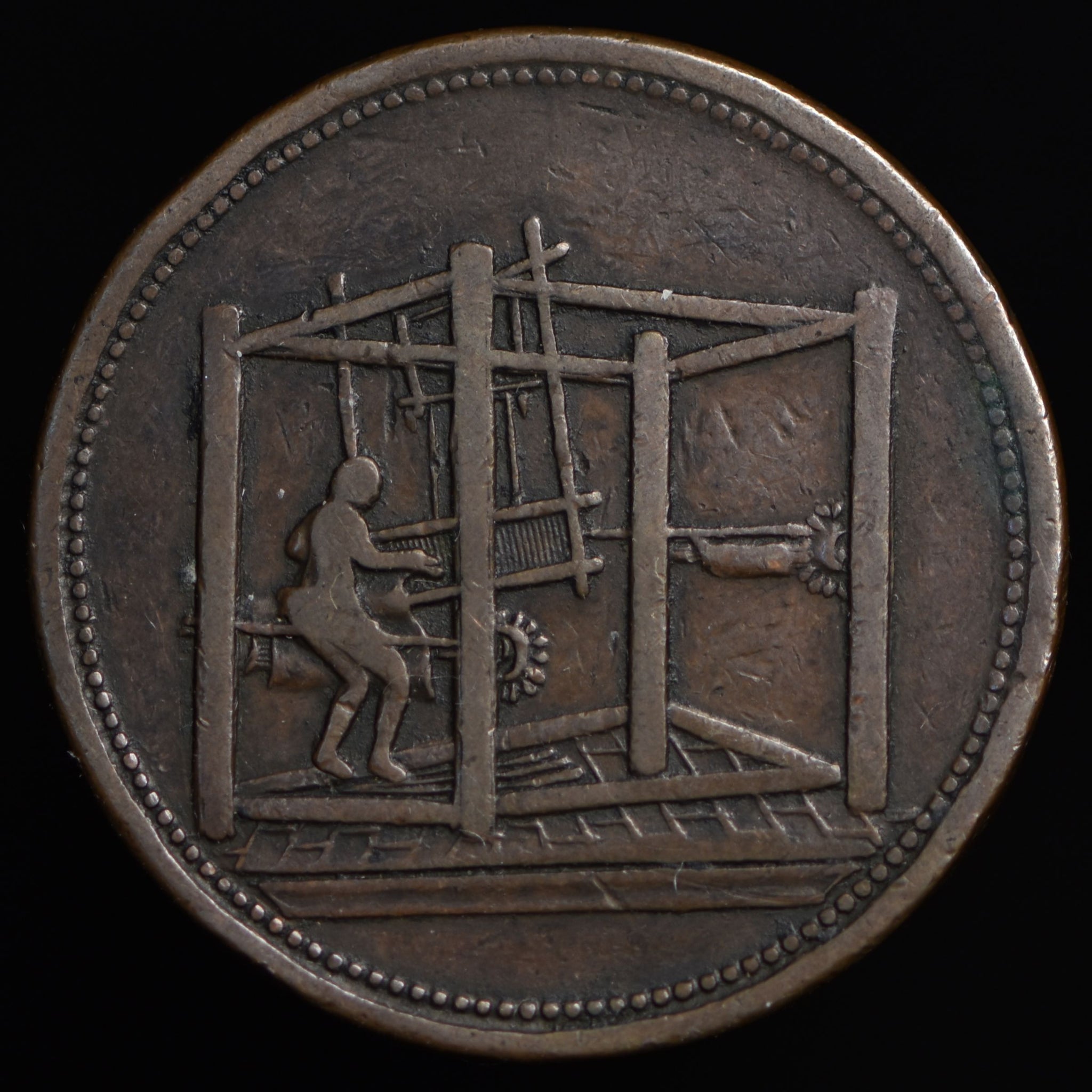 Obv: Man weaving in a loom. Rev: PENNY TOKEN in center circle, PAYABLE AT JACKSON & LISTERS WAREHOUSE BARNSLEY around. Edge: center grained.
