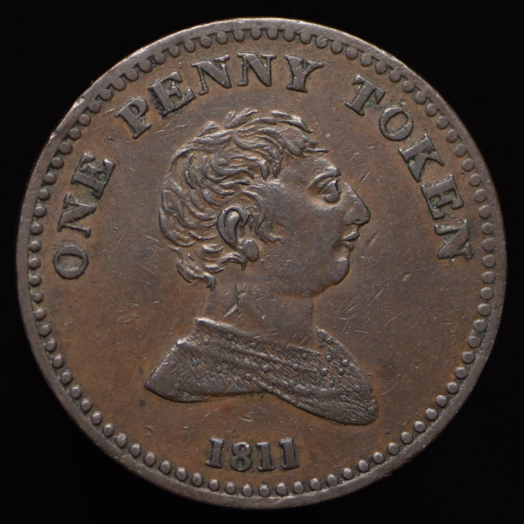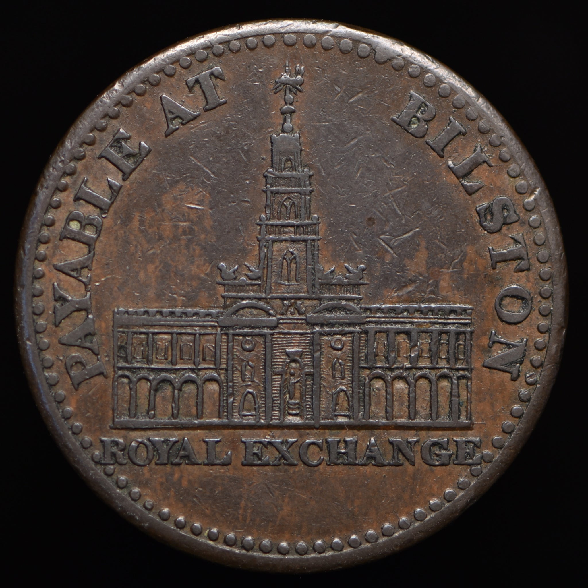 Obv: Bust facing right, ONE PENNY TOKEN around, 1811 below. Rev: View of Exchange, PAYABLE BILSTON around, ROYAL EXCHANGE in exergue. Edge: Plain.
