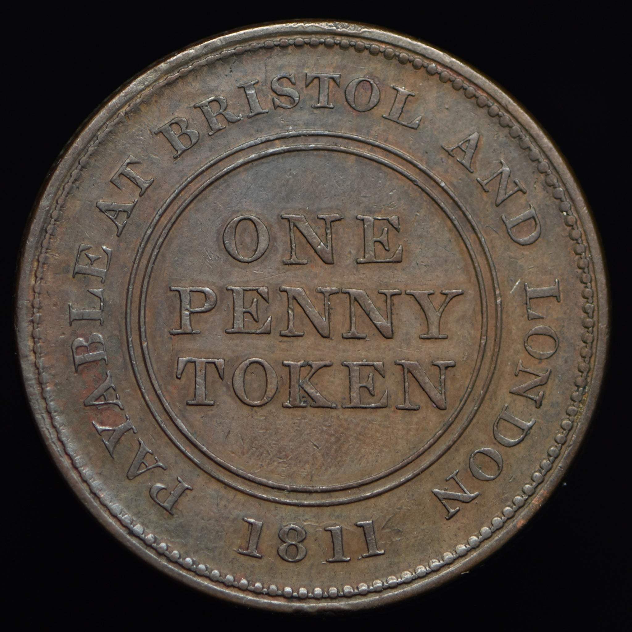 Obv: A ship in center circle, PATENT SHEATHING NAIL MANUFACTORY around, BRISTOL below. Rev: ONE PENNY TOKEN in center double circle, PAYABLE AT BRISTOL AND LONDON around, 1811 below. Edge: Center grained.