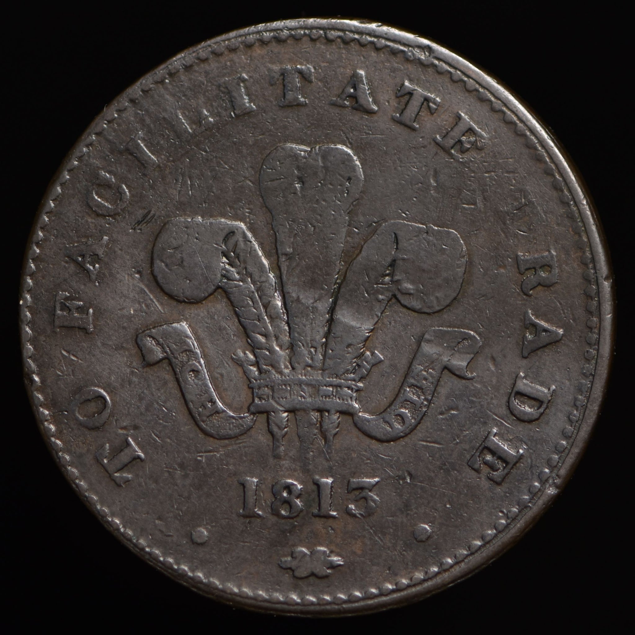 Obv: View of a building, PAYABLE AT THE EXCHANGE around, BURTON in exergue. Rev: Prince of Wales' plumes, TO FACILITATE TRADE around, 1813 below. Edge: Neatly grained.