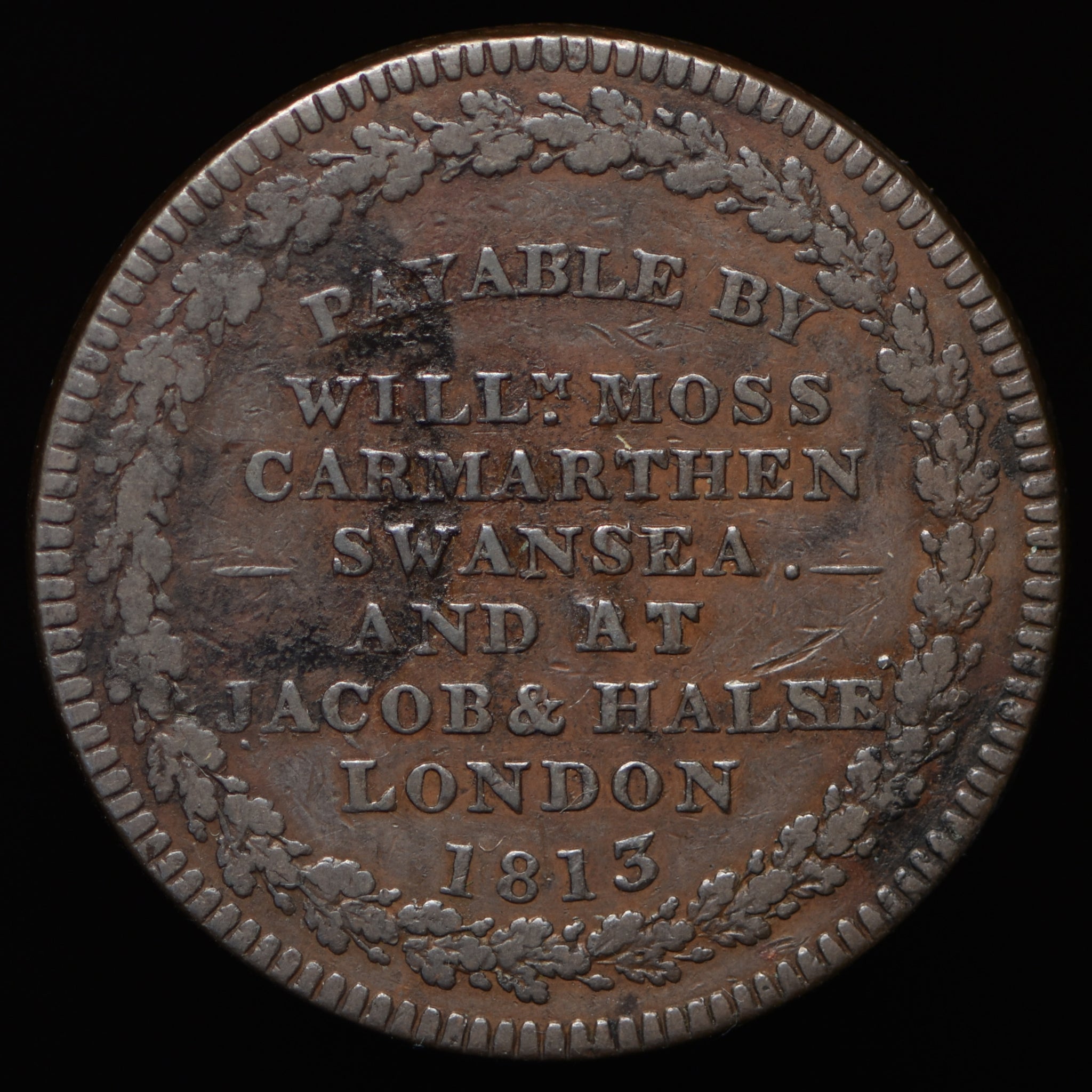 Obv: Arms of Carmarthen, CARMATHEN above, PENNY below. Rev: PAYABLE BY WILLM MOSS CARMARTHEN - SWANSEA. - AND AT JACOB & HALSE LONDON 1813 within an oak wreath. Edge: Center grained.