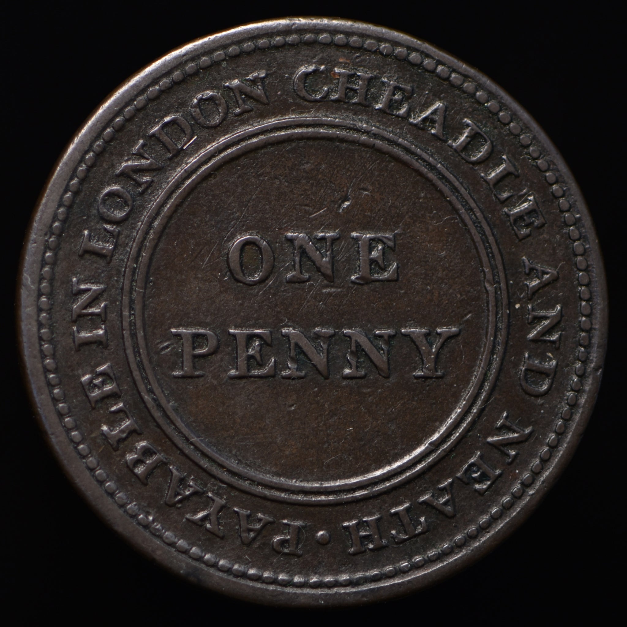 Obv: TOKEN 1812 in center double circle, CHEADLE COPPER & BRASS COMPANY around. Rev: ONE PENNY in center double circle, PAYABLE IN LONDON CHEADLE AND NEATH around. Edge: Center grained.
