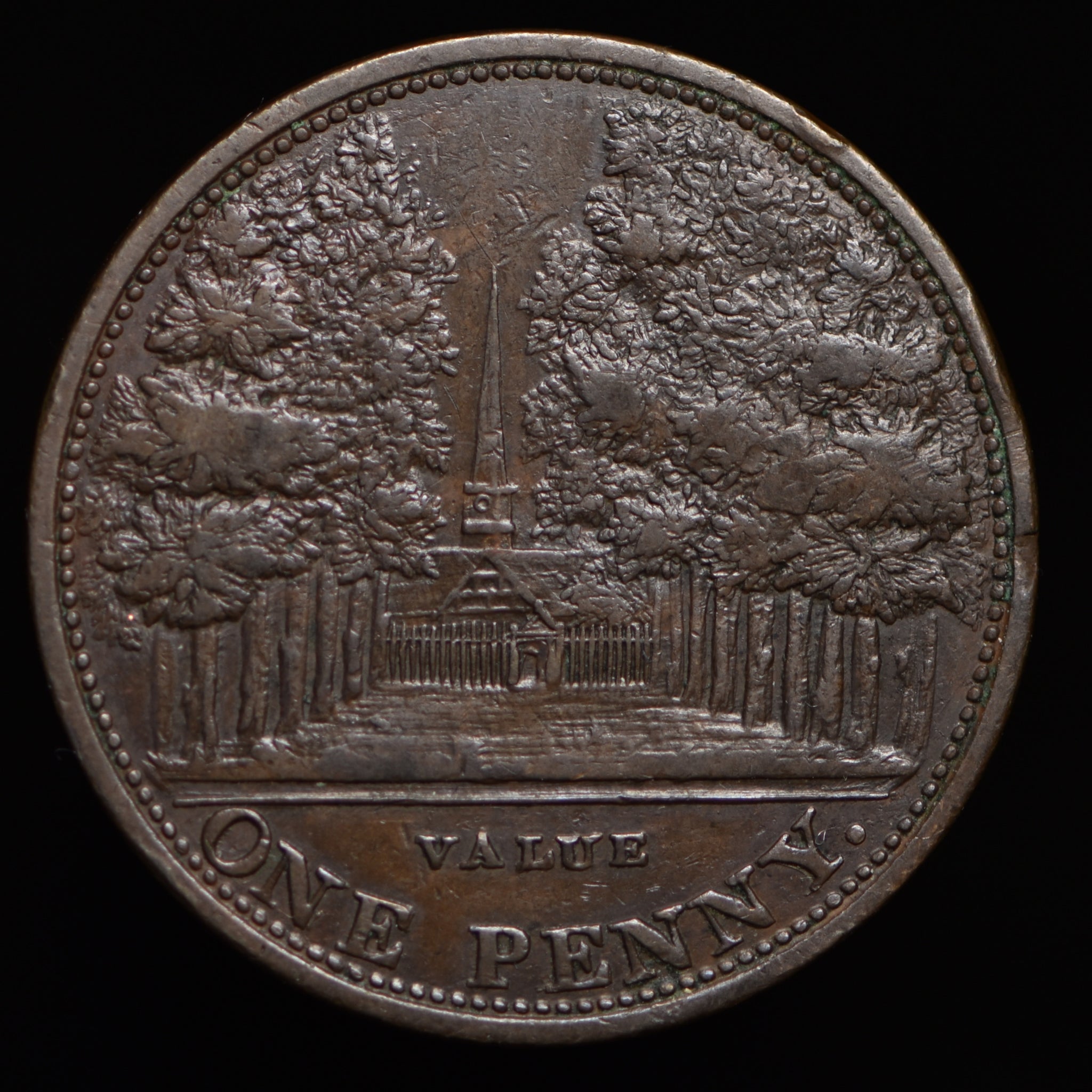 Obv: A POUND NOTE FOR 240 TOKENS GIVEN BY JOHN BISHOP & CO. CHELTENHAM 1812 in seven lines. Rev: View of St. Mary’s church through an avenue of trees. Edge: center grained.