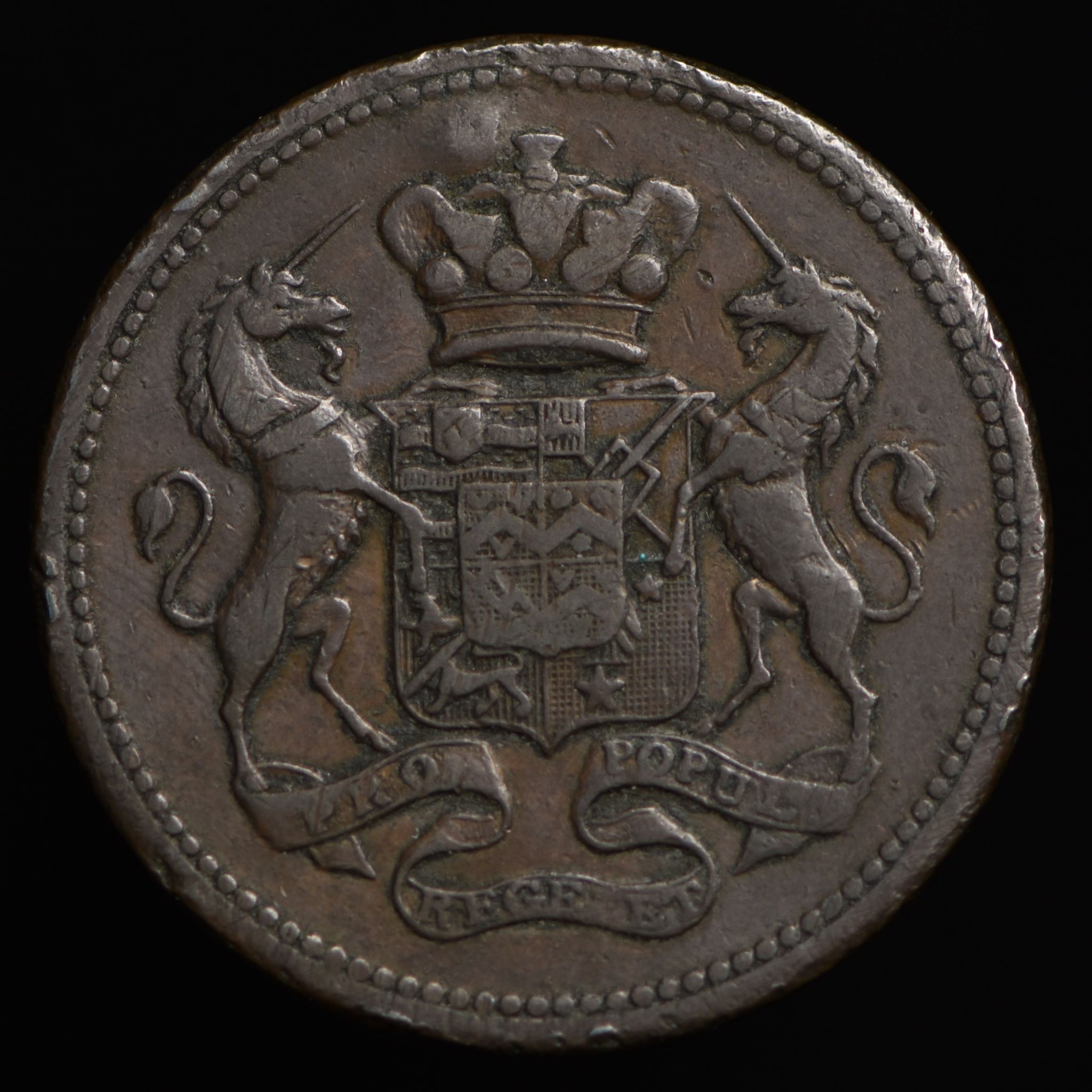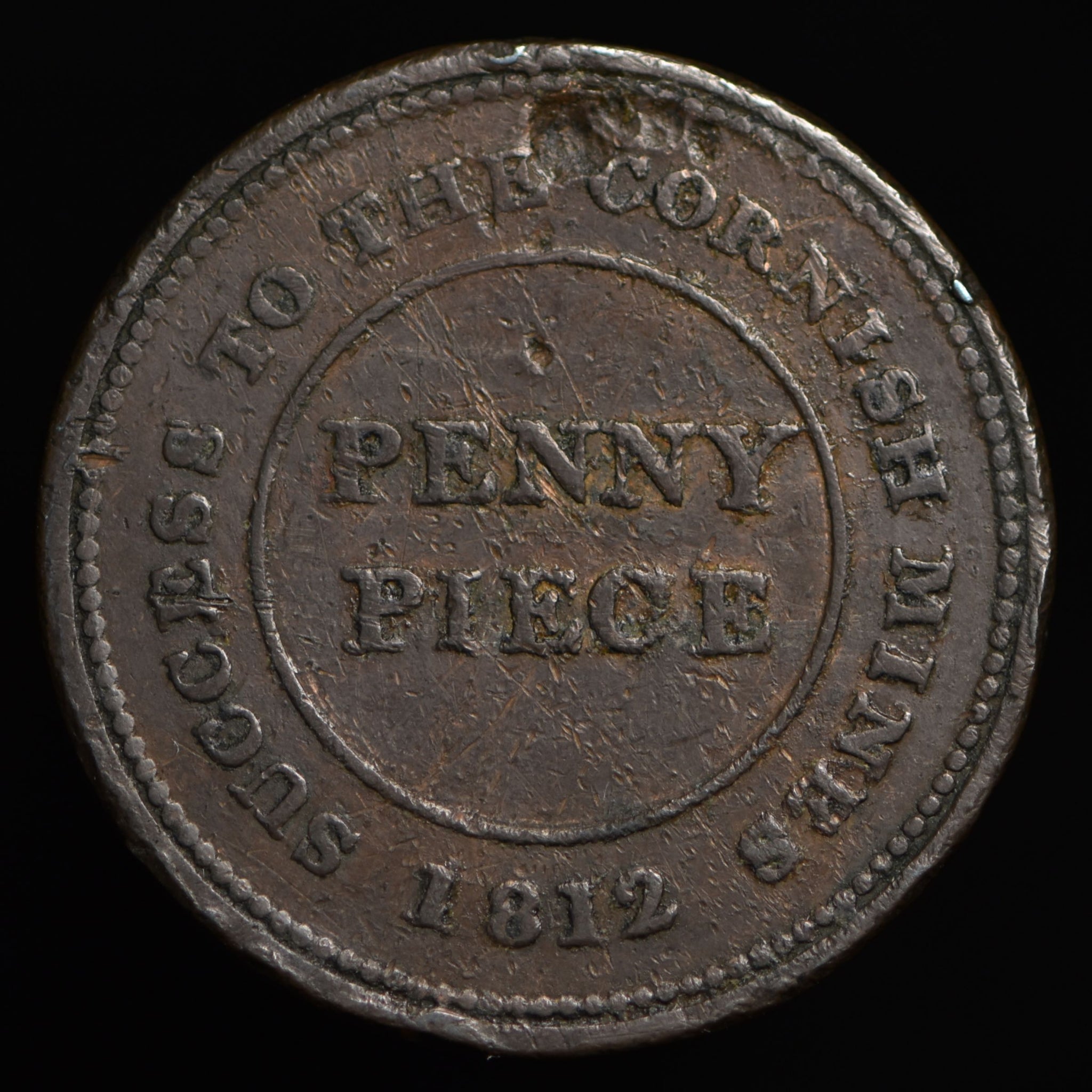 Obv: PENNY PIECE in center circle, SUCCESS TO THE CORNISH MINES around, 1812 below. Rev: Arms and supporters. Edge: Center grained.