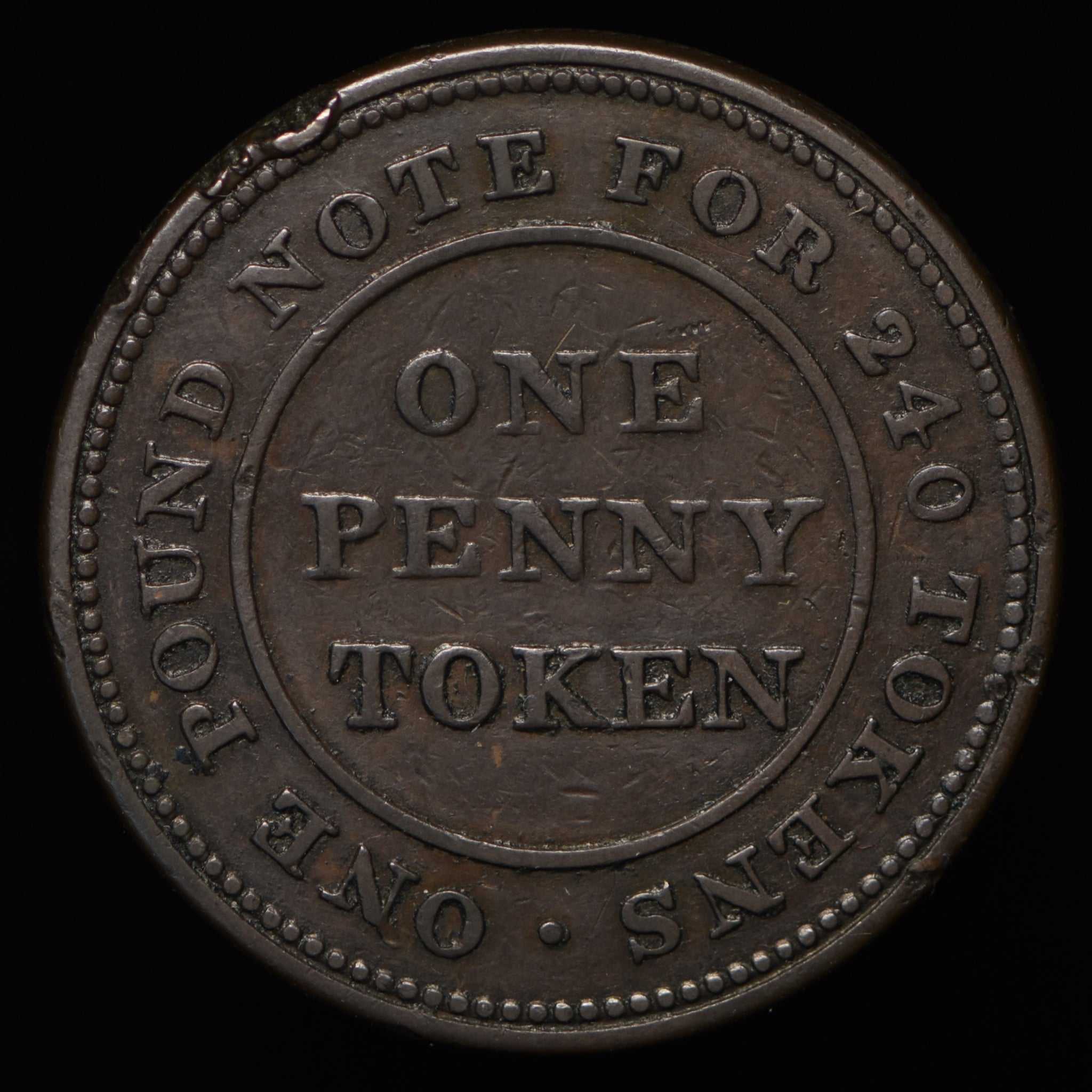 Obv: View of factory buildings, GLANCLYWEDOG above, FACTORY below, 1813 below factory. Rev: ONE PENNY TOKEN in center circle, ONE POUND NOTE FOR 240 TOKENS around. Edge: Center grained.