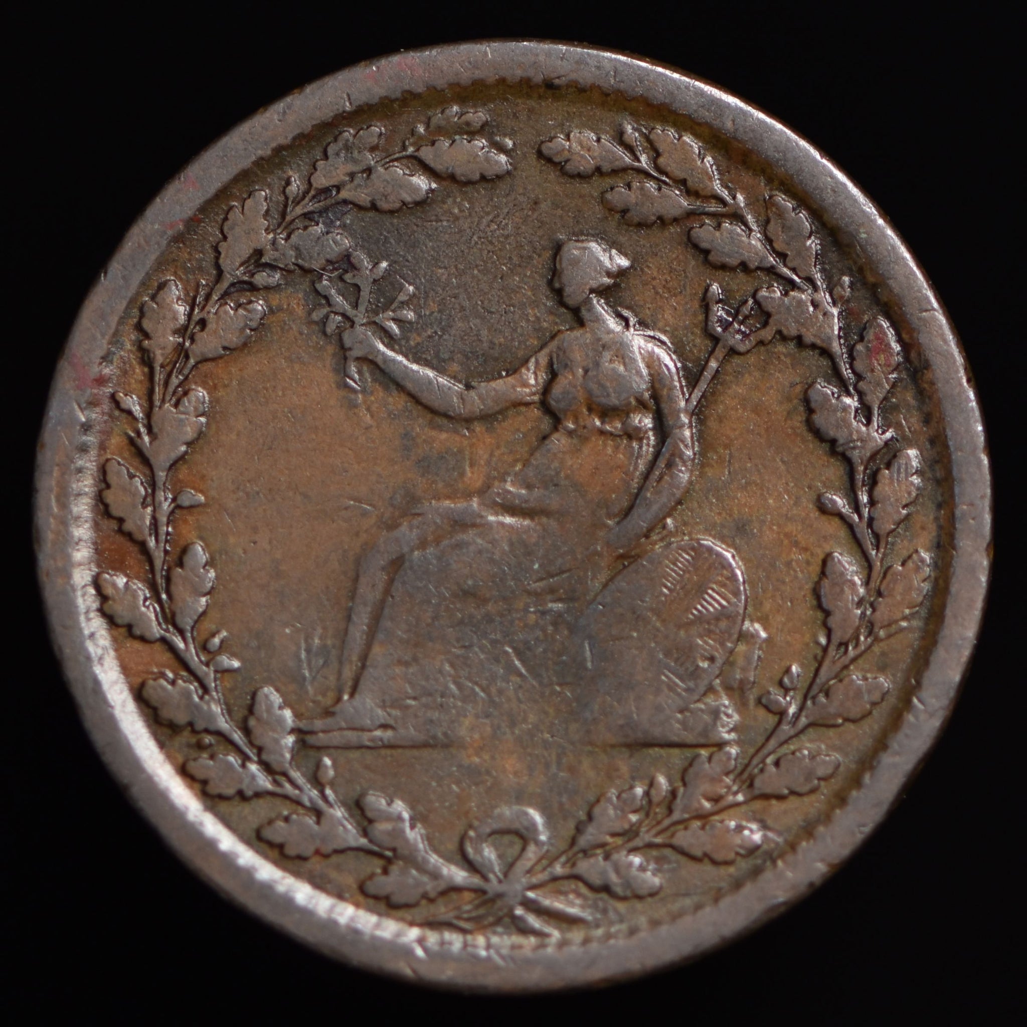 Obv: Laureate, draped bust, 1811 below, VINCIT AMOR PATRIA around. Rev: Britannia seated left, holding olive branch and trident, within oak wreath. Edge: Center grained.