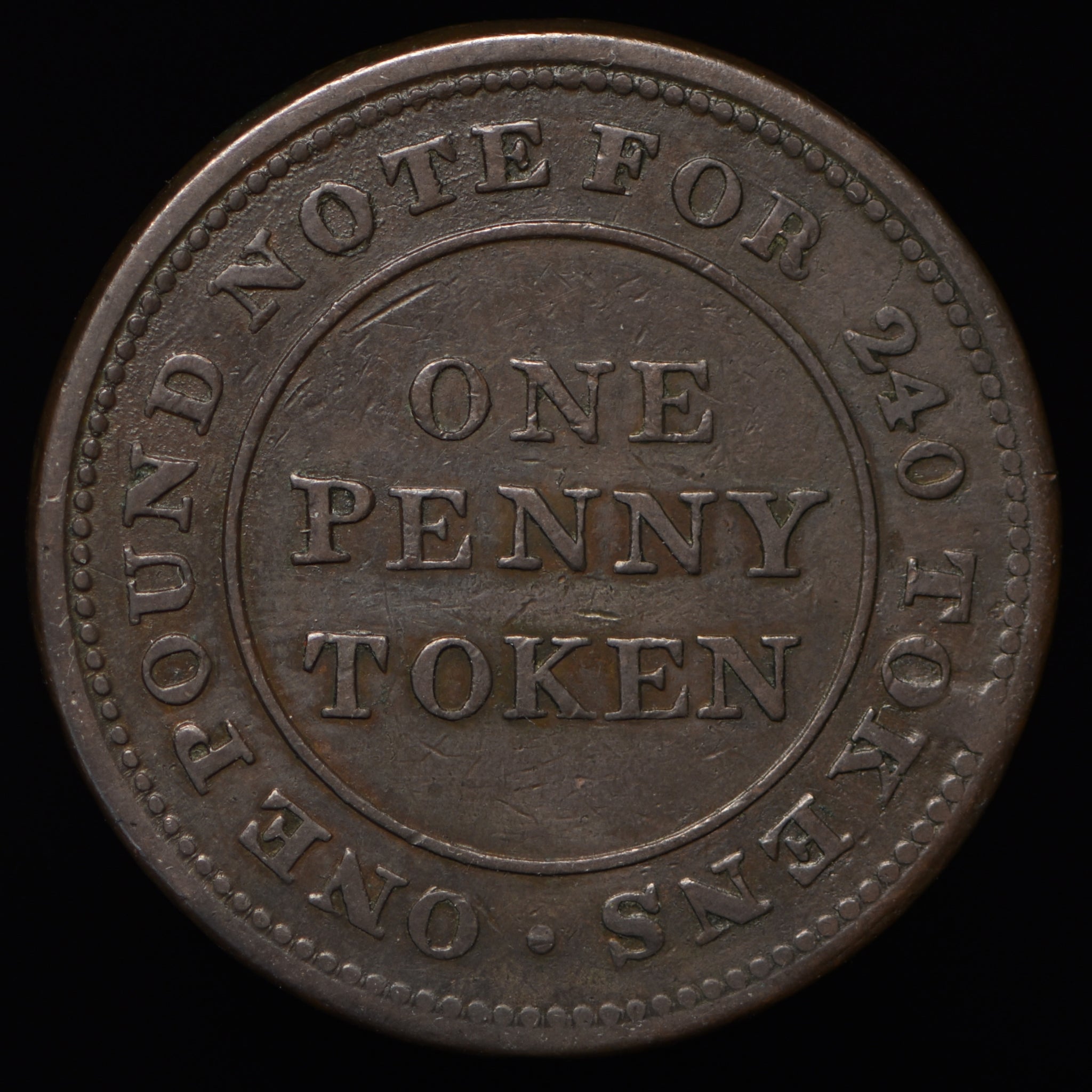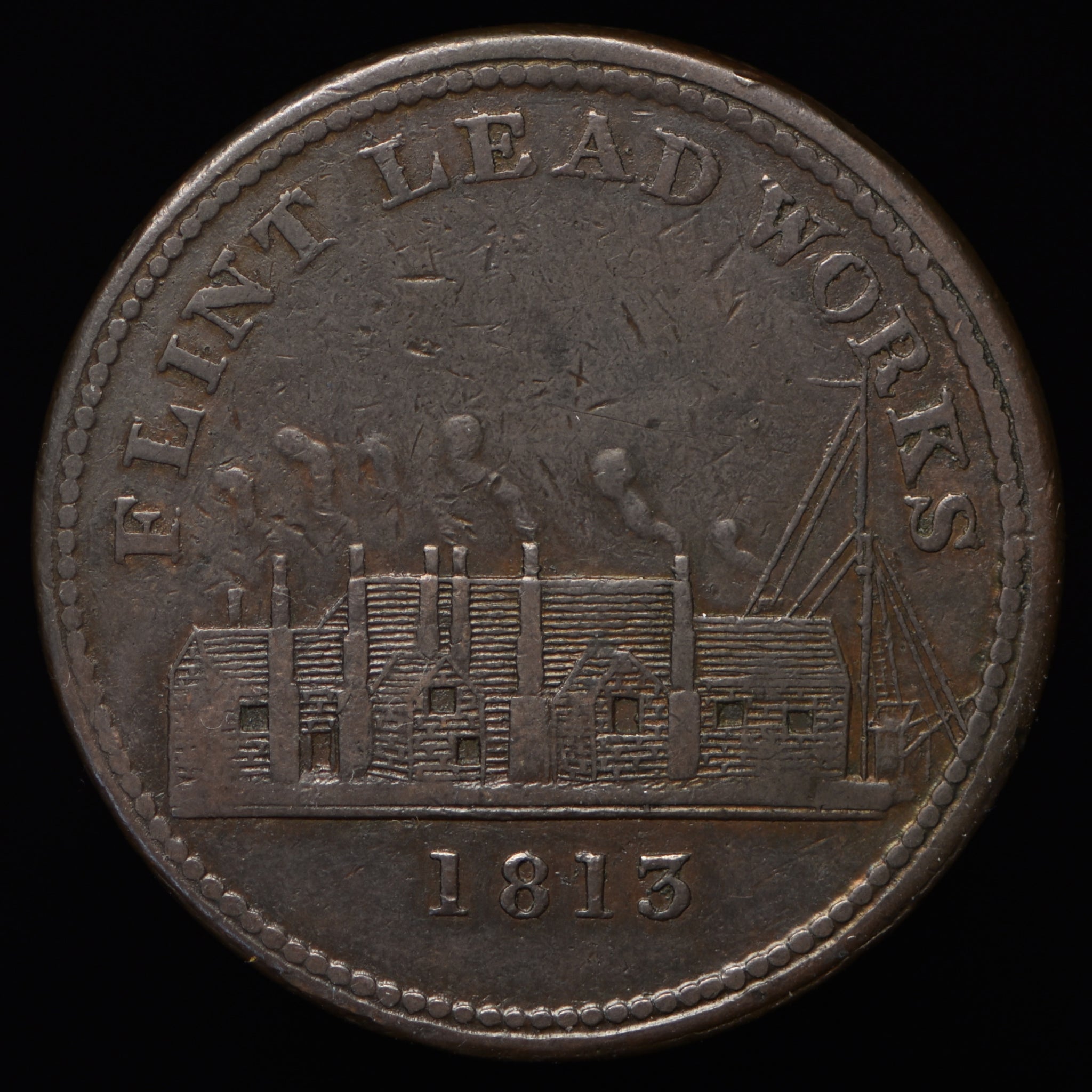 Obv: View of factory buildings, FLINT LEAD WORKS above, 1813 in exergue. Rev: ONE PENNY TOKEN in center circle, ONE POUND NOTE FOR 240 TOKENS around. Edge: Center grained.
