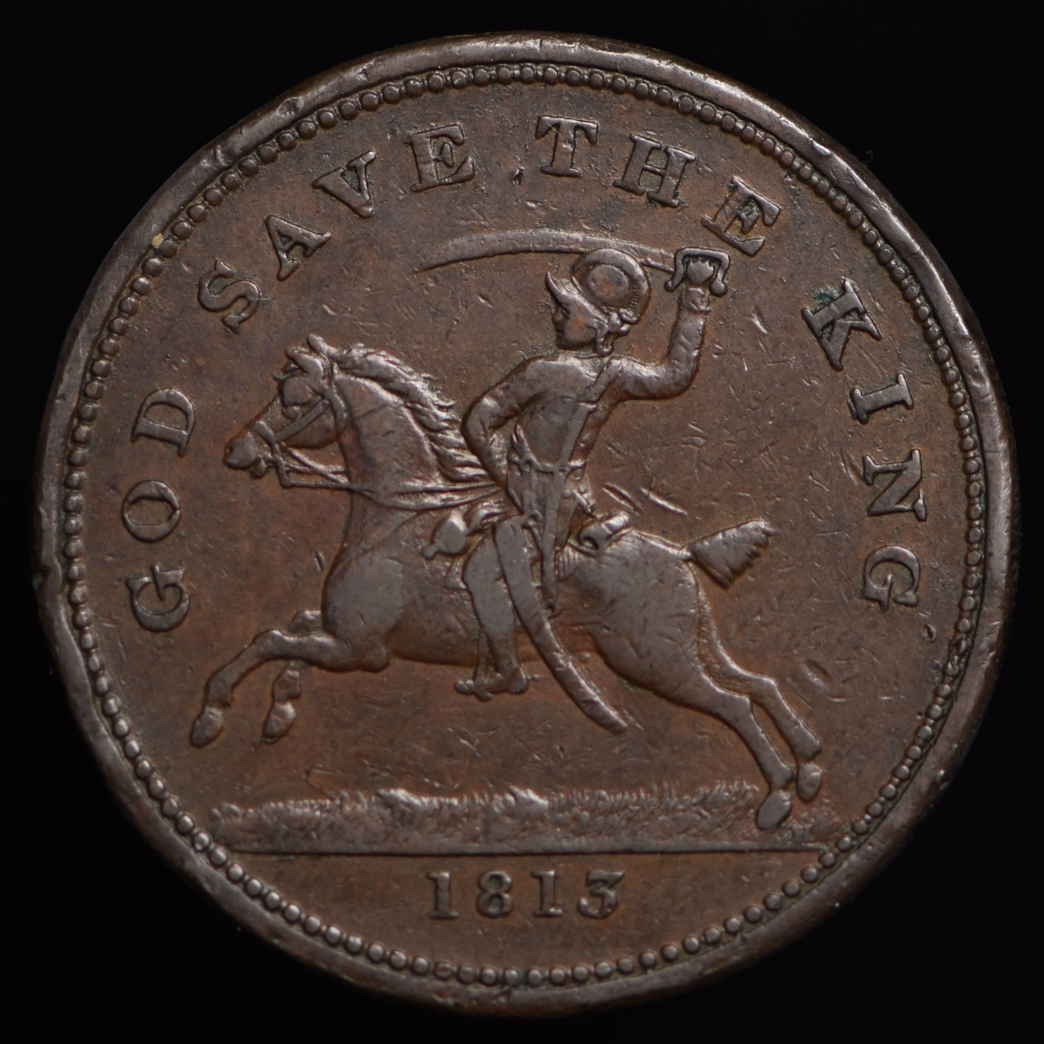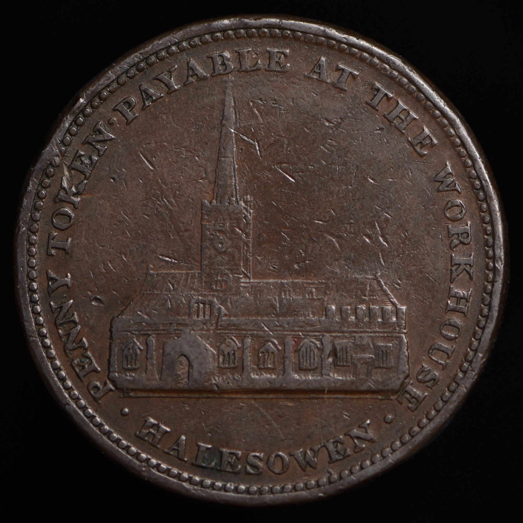 Obv: View of St. Mary's church, PENNY TOKEN PAYABLE AT THE WORKHOUSE around, HALESOWEN below. Rev: a mounted yeoman with drawn sword, GOD SAVE THE KING around, 1813 in exergue. Edge: Center grained.