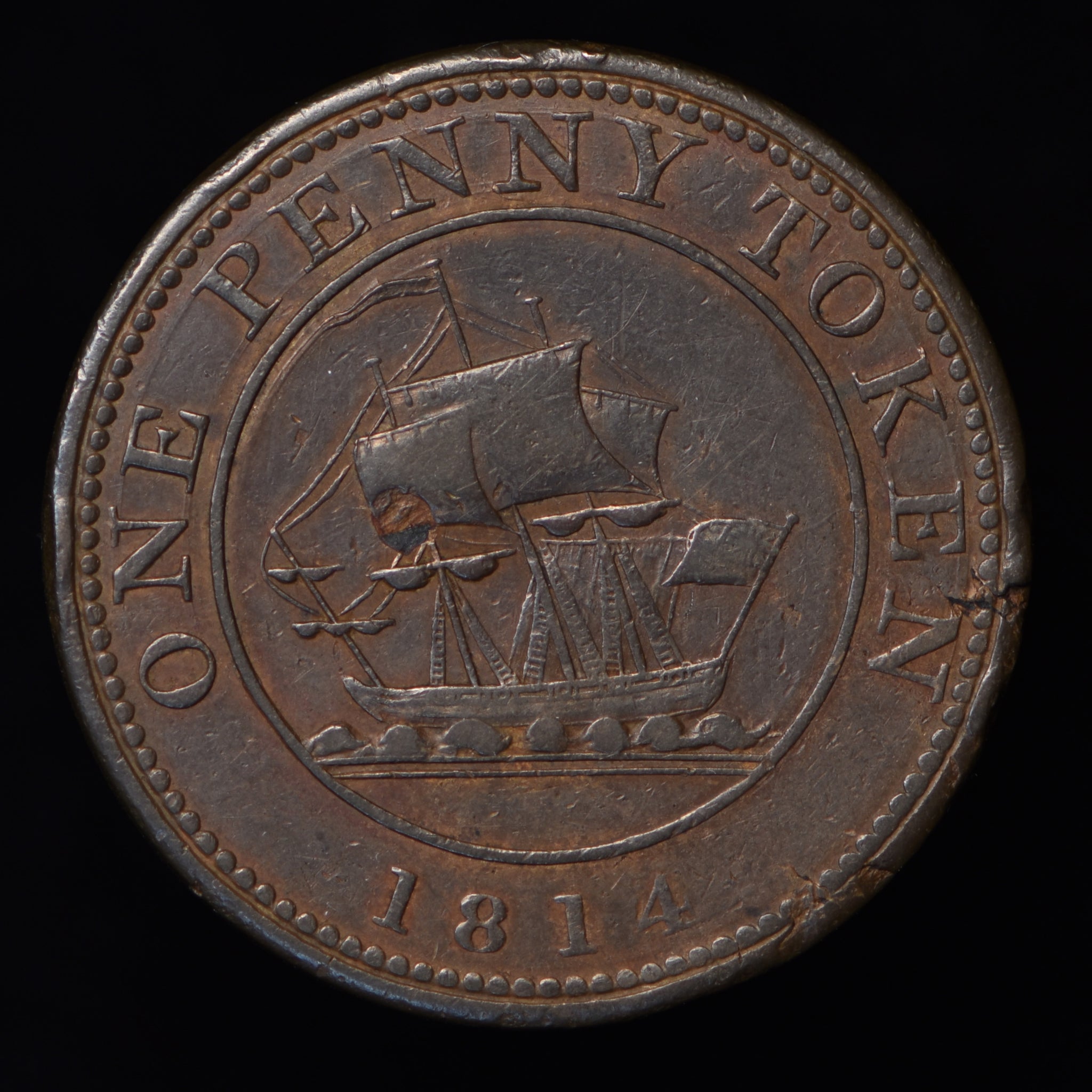 Obv: R H cypher within a continuous oak wreath. Rev: a Ship, ONE PENNY TOKEN above, 1814 below. Edge: center grained.