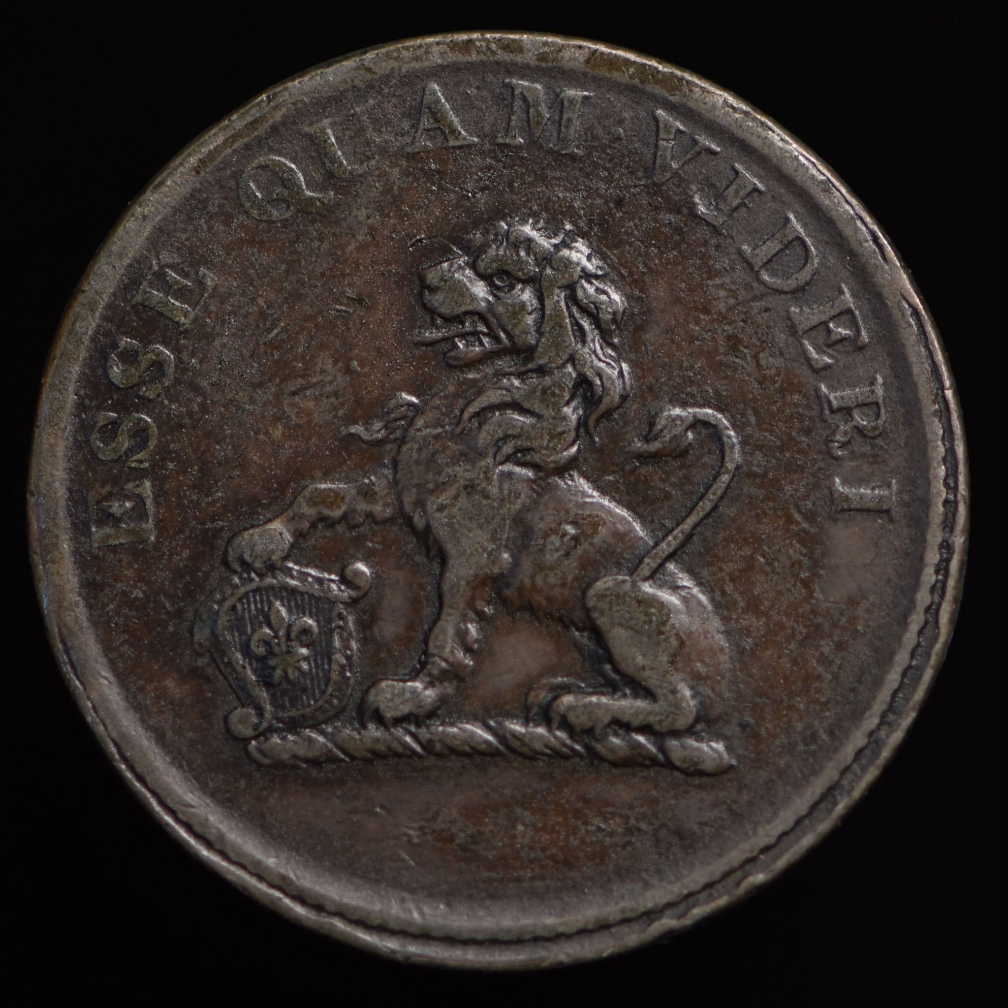 Obv: HULL HALF PENNY 1812 in four lines center, PAYABLE BY I.K. PICARD. LEAD WORKS HULL around. Rev: A lion seated left, it's paw on a shield, ESSE QUAM VIDERI around. Edge: Neatly grained.