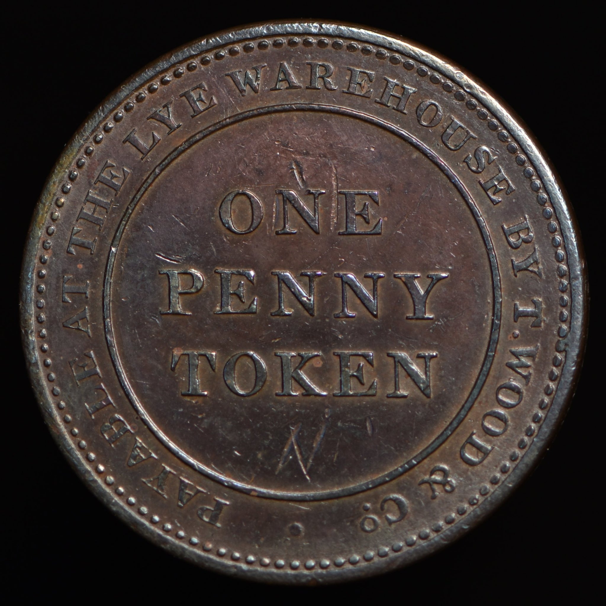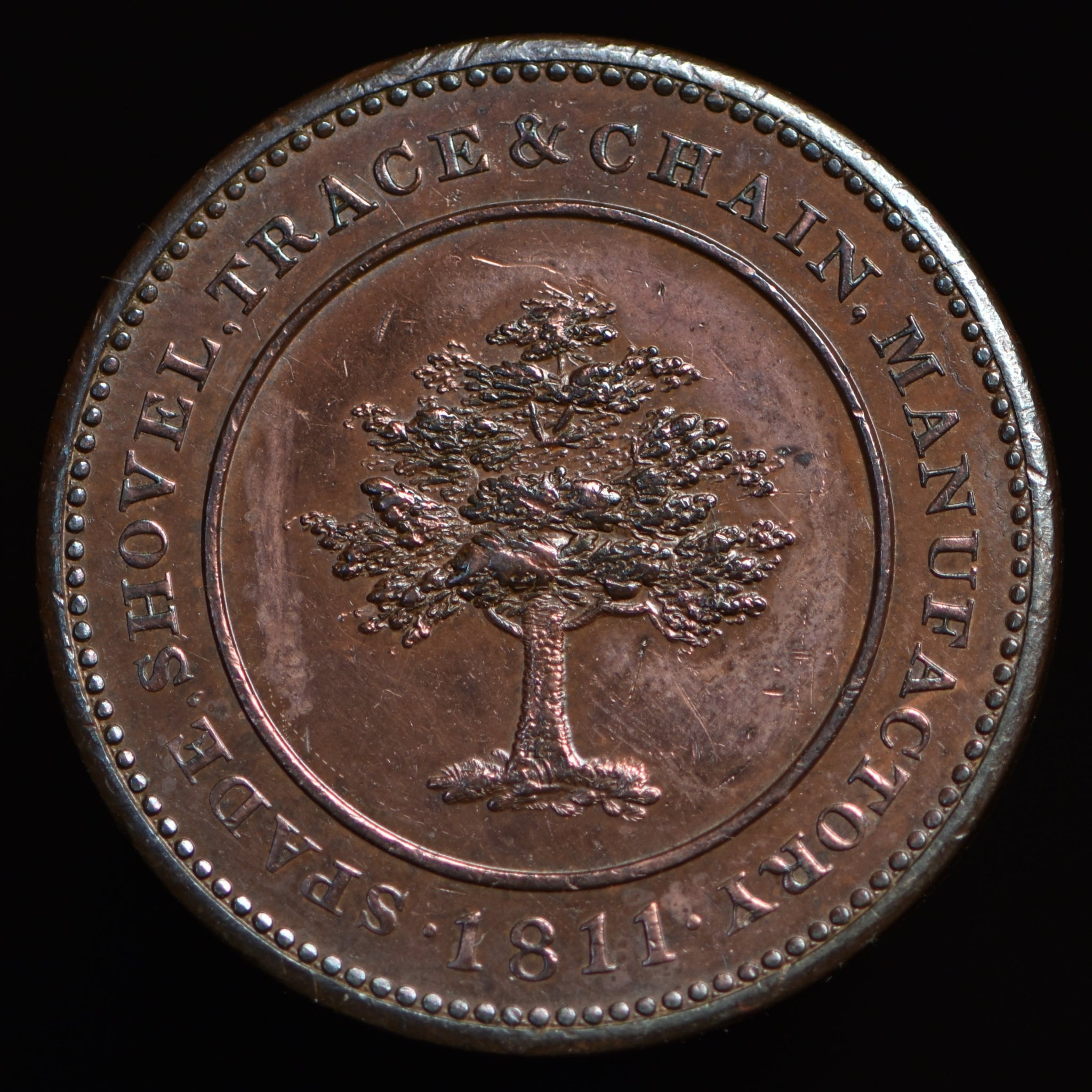 Obv: ONE PENNY TOKEN in center circle, PAYABLE AT THE LYE WAREHOUSE BY T. WOOD & CO. around. Rev: A tree in center circle, SPADE, SHOVEL, TRACE & CHAIN, MANUFACTORY 1811 around. Edge: Center grained.