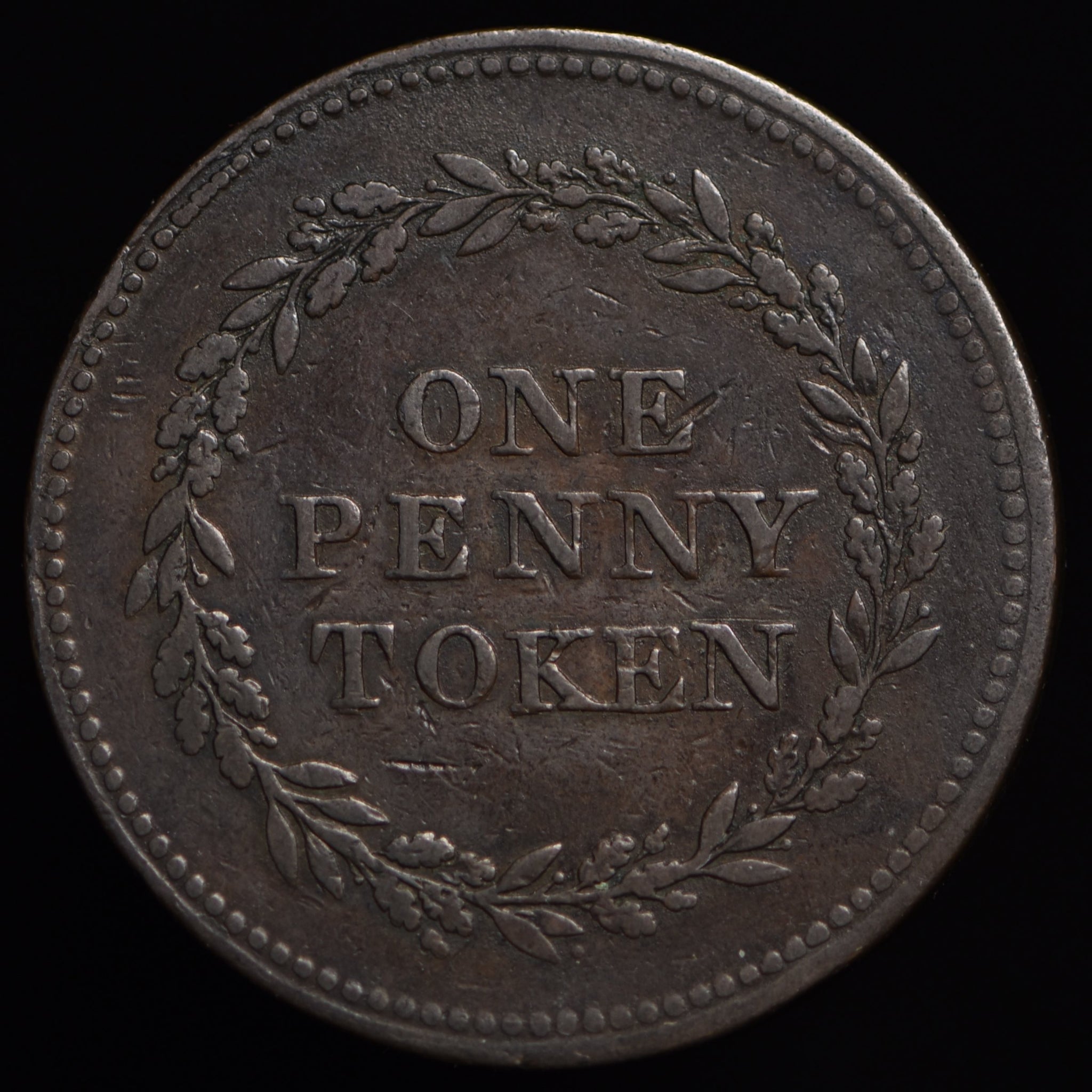 Obv: WM. BAKER NOTTINGHAM in center circle, A POUND NOTE FOR 240 TOKENS 1813 around. Rev: ONE PENNY TOKEN within wreath of oak and laurel. Edge: Grained.