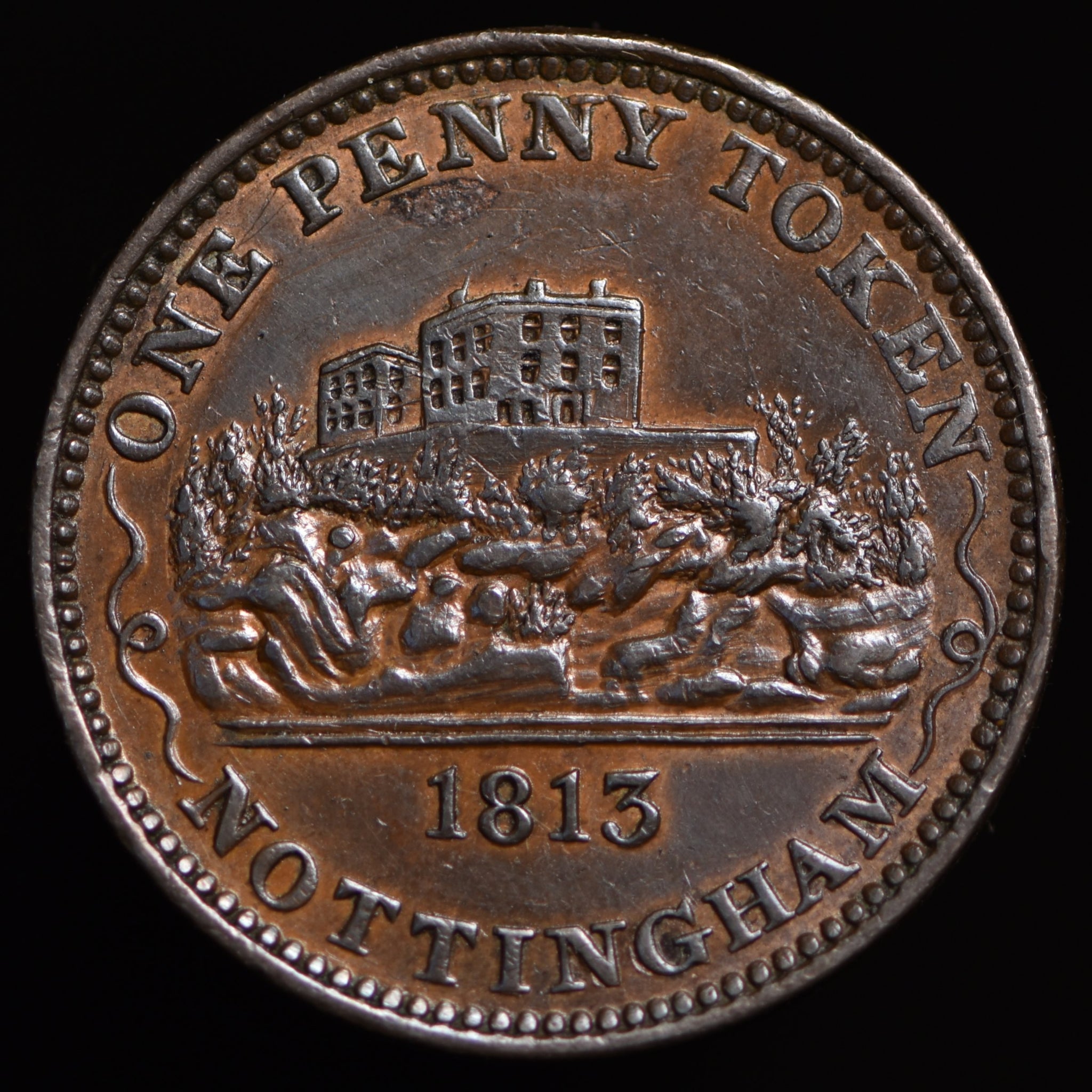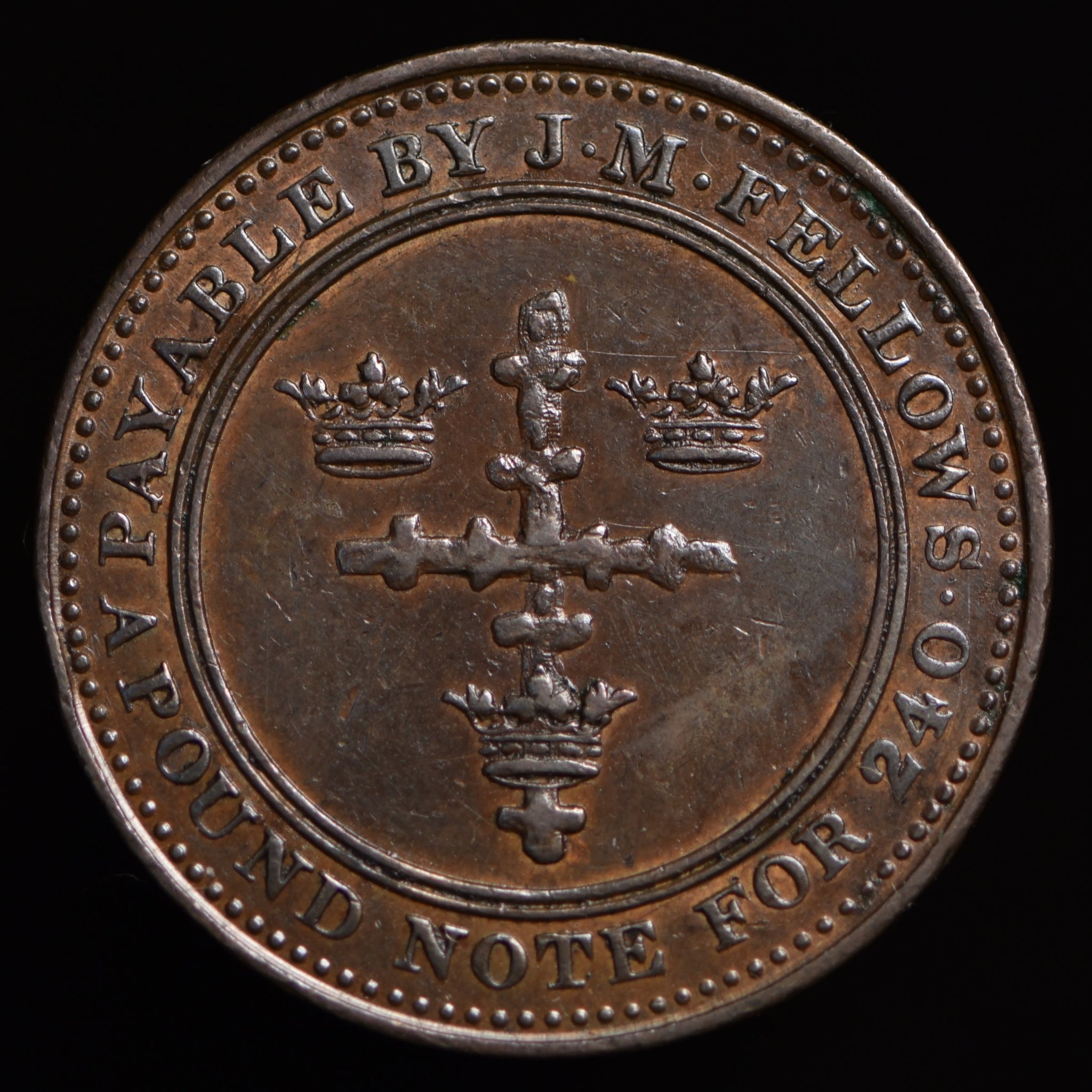 Obv: Arms within double circle, A POUND NOTE FOR 240 PAYABLE BY J.M. FELLOWS around. Rev: View of Nottingham Castle, ONE PENNY TOKEN above, 1813 NOTTINGHAM in exergue. Edge: Center grained.