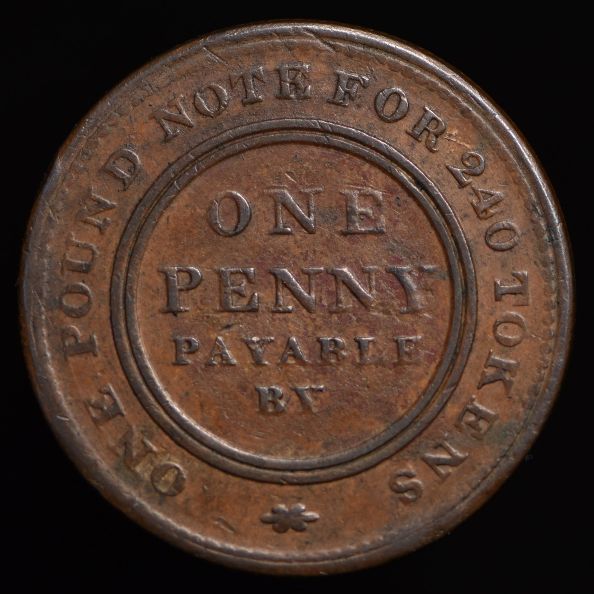 Obv: ONE PENNY PAYABLE BY in four lines in center double circle, ONE POUND NOTE FOR 240 TOKENS around. Rev: EDWARD BARKER RUGELY in three lines. Edge: Grained.
