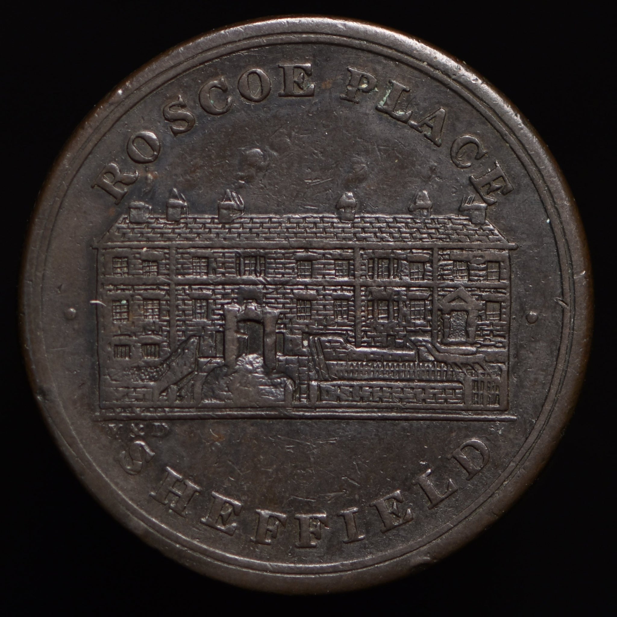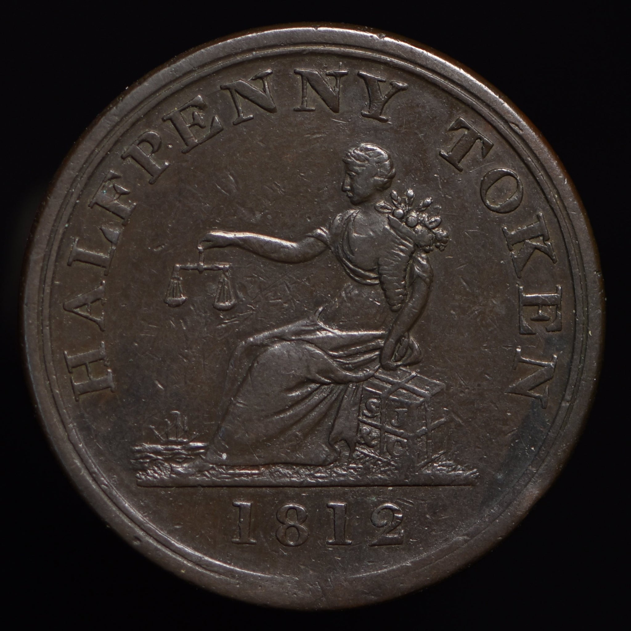 Obv: View of factory building, ROSCOE PLACE above, SHEFFIELD below. Rev: Commerce seated on bale labelled S J & Co, HALFPENNY TOKEN around, 1812 in exergue. Edge: Center grained.