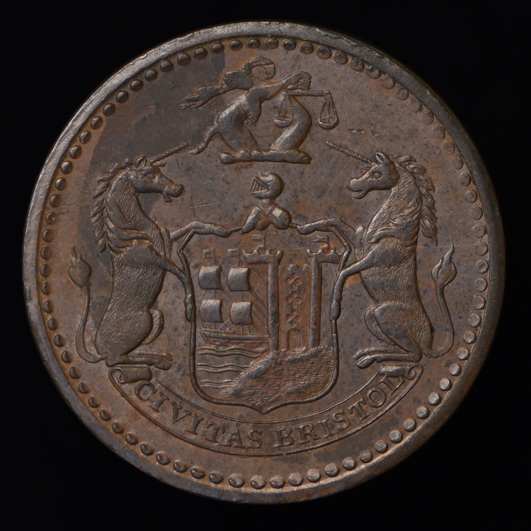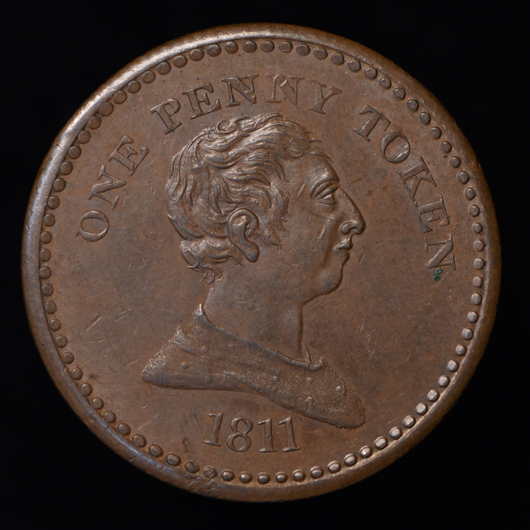 Obv: Bust of George III right, ONE PENNY TOKEN above, 1811 below. Rev: Arms with unicorn supporters, CIVITAS BRISTOL on scroll below. Edge: center grained.