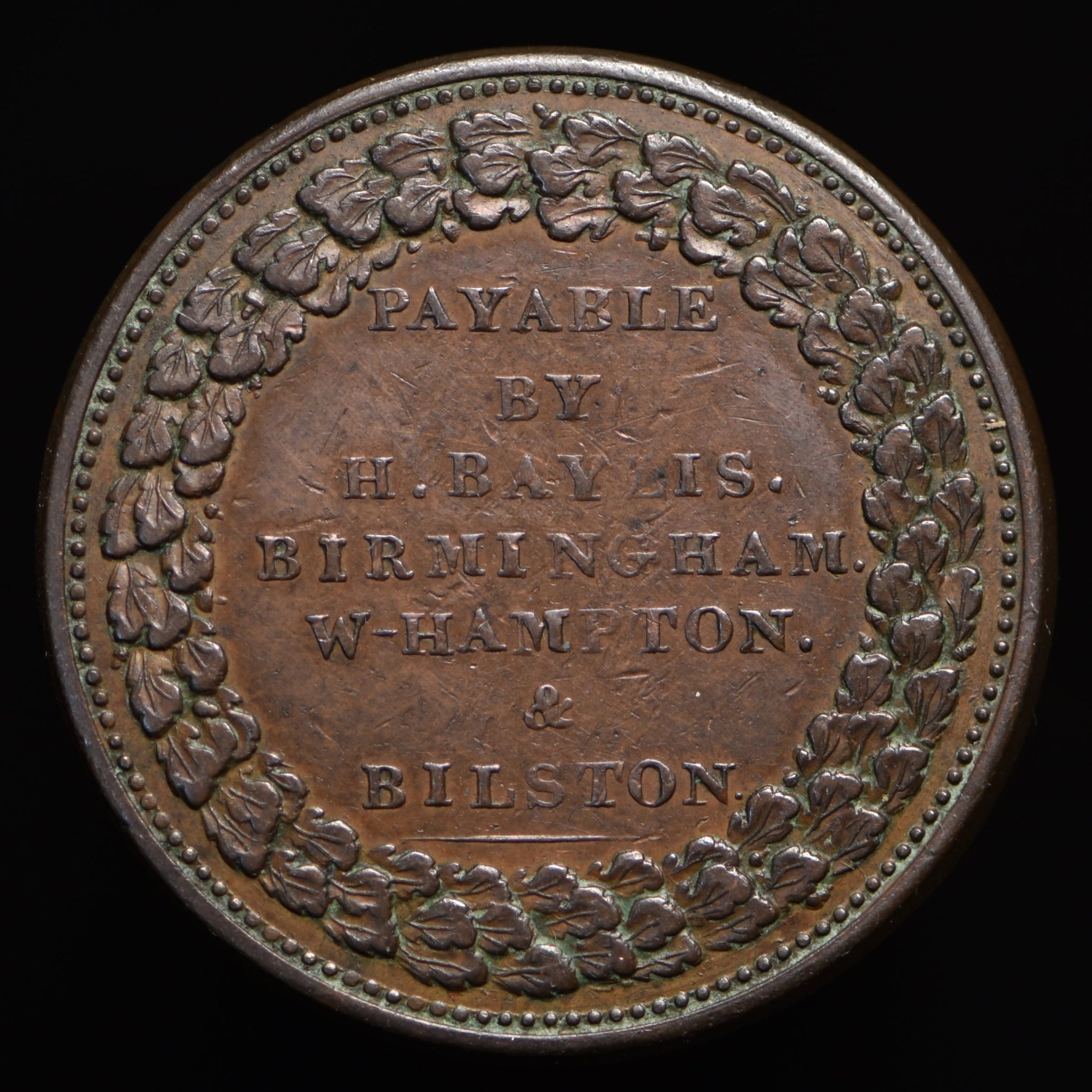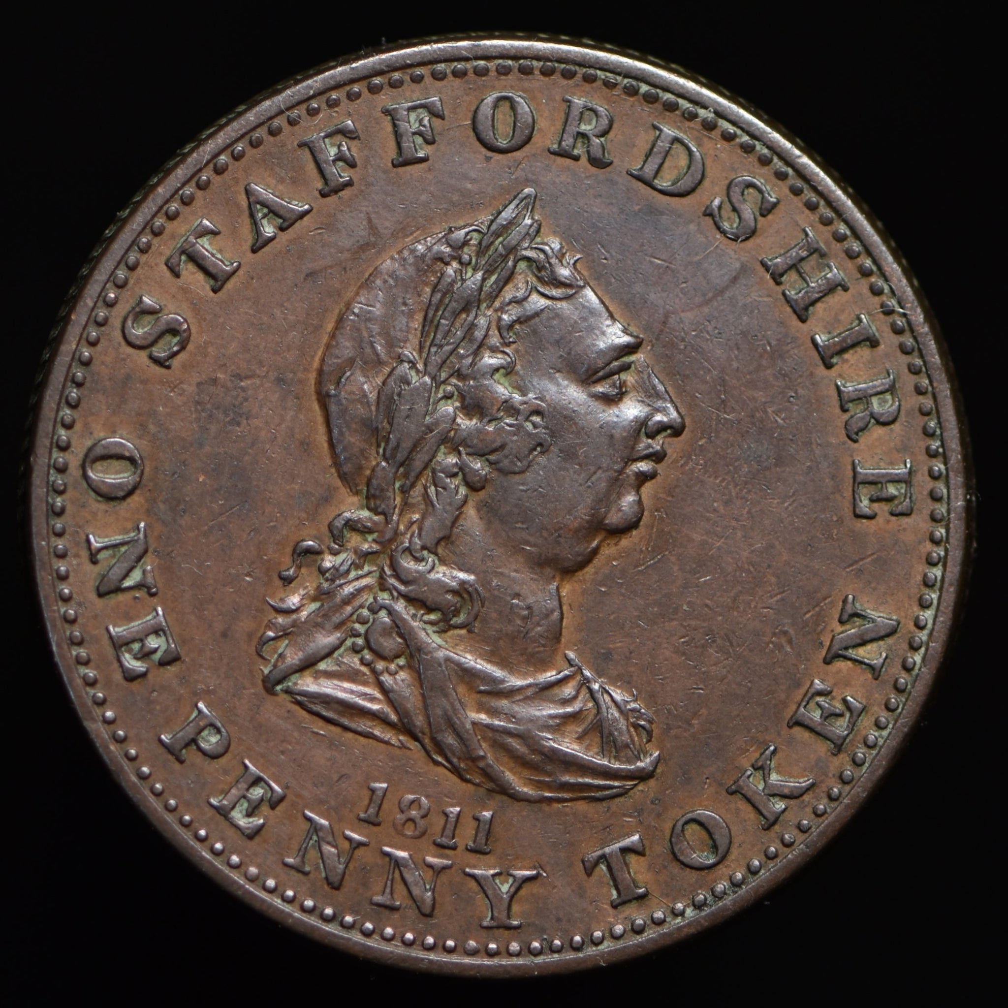 Obv: Draped and laureate bust of George III, 1811 below bust, STAFFORDSHIRE above, ONE PENNY TOKEN below. Rev: PAYABLE BY H. BAYLIS. BIRMINGHAM. W-HAMPTON. & BILSTON in seven lines within oak wreath. Edge: Center grained.