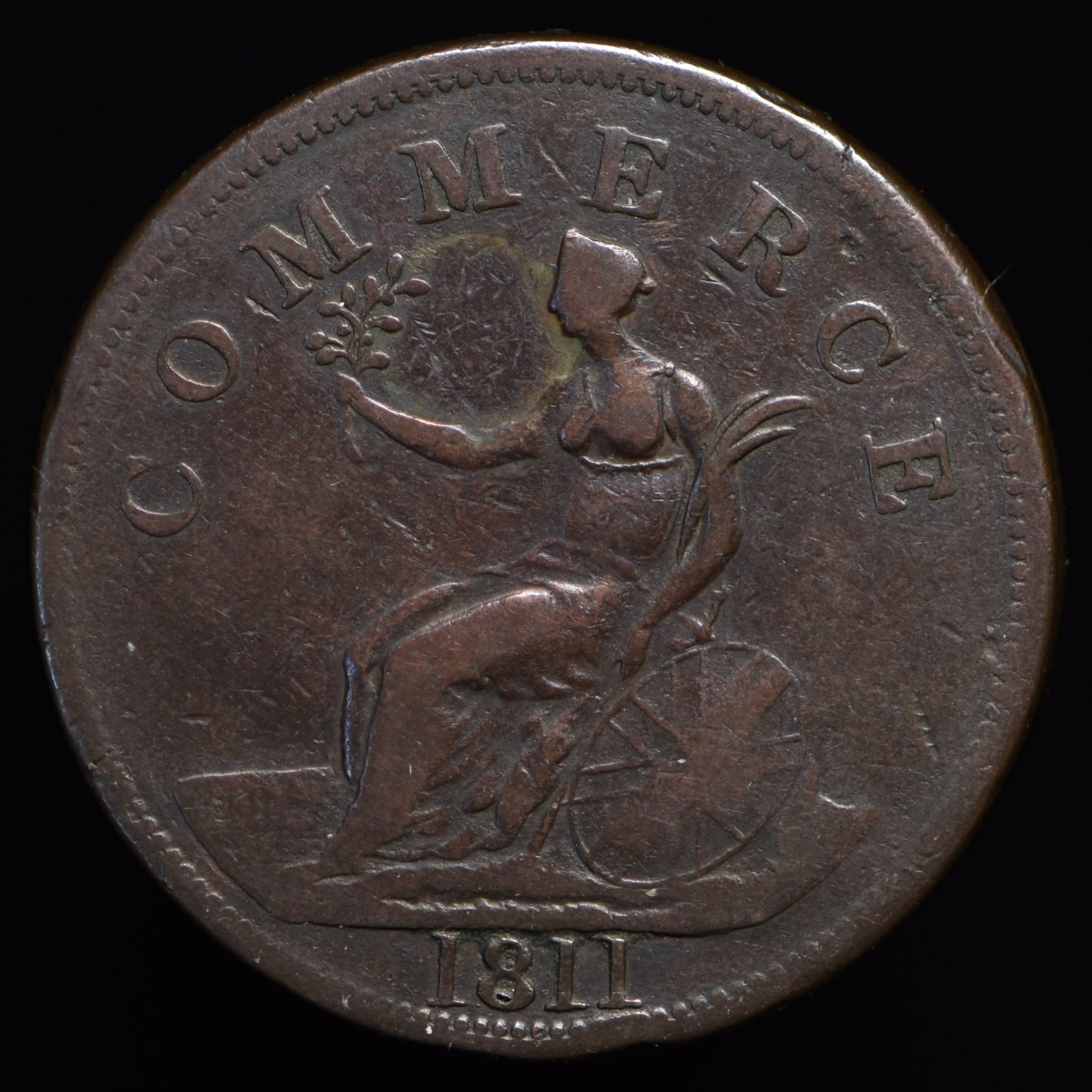 Obv: Bust of George III, STAFFORDSHIRE above, PENNY TOKEN below in small letters. Rev: Britannia seated left, holding palm and olive branches, 1811 in exergue, COMMERCE above. Edge: Center grained.