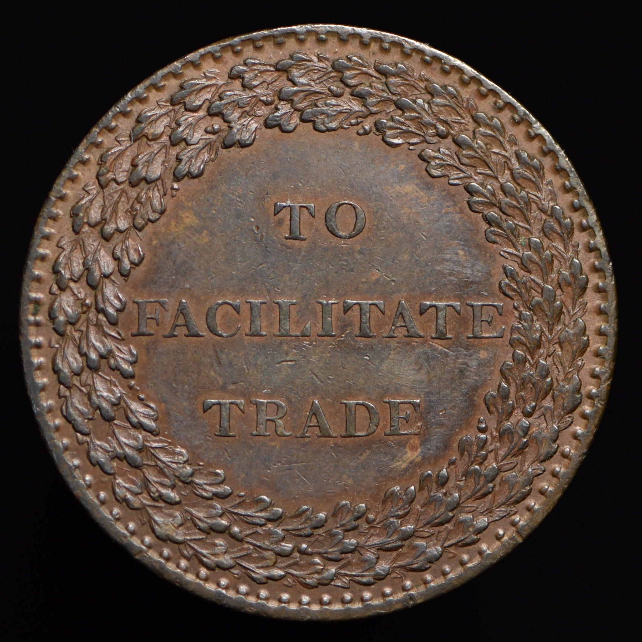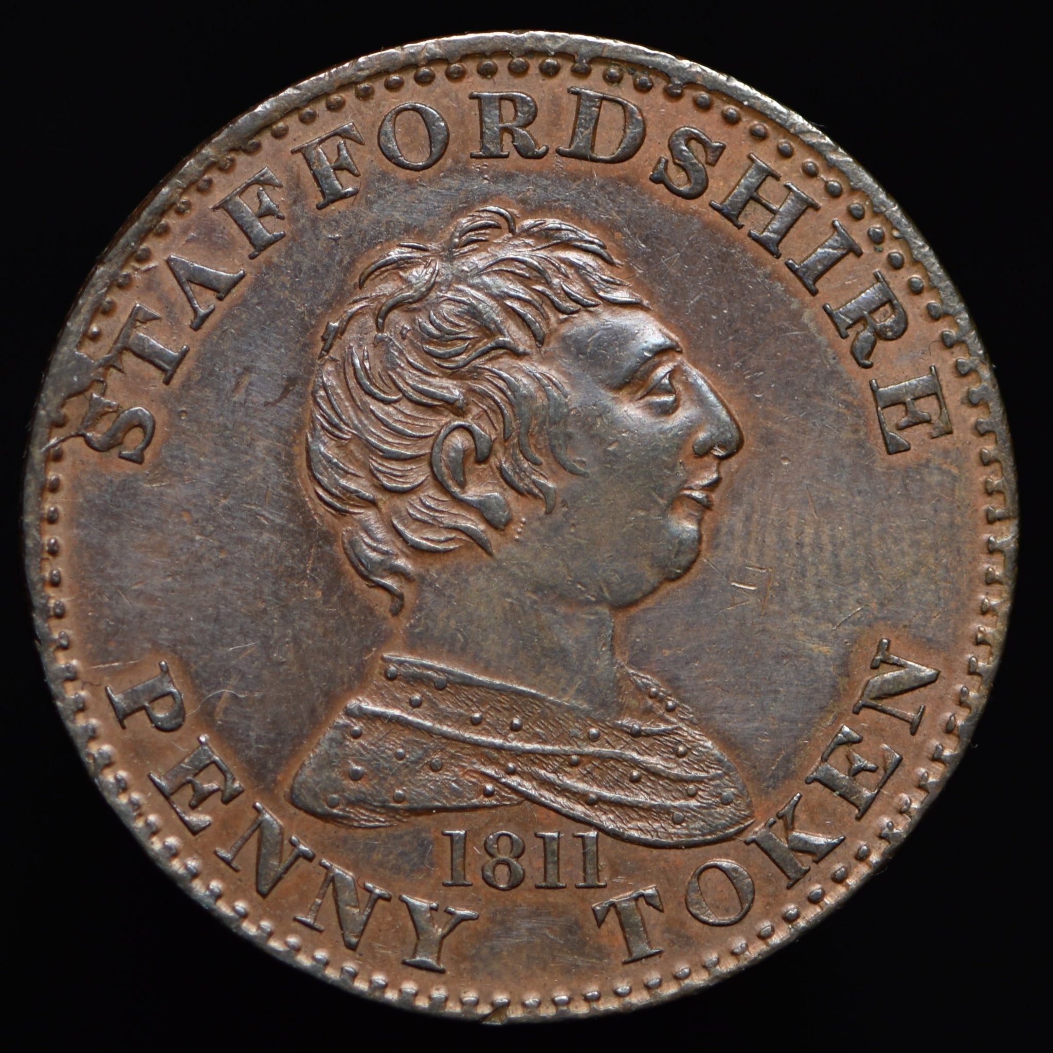 Obv: Bust of George III, STAFFORDSHIRE above, PENNY TOKEN 1811 below. Rev: TO FACILITATE TRADE within a wreath of oak. Edge: center grained.